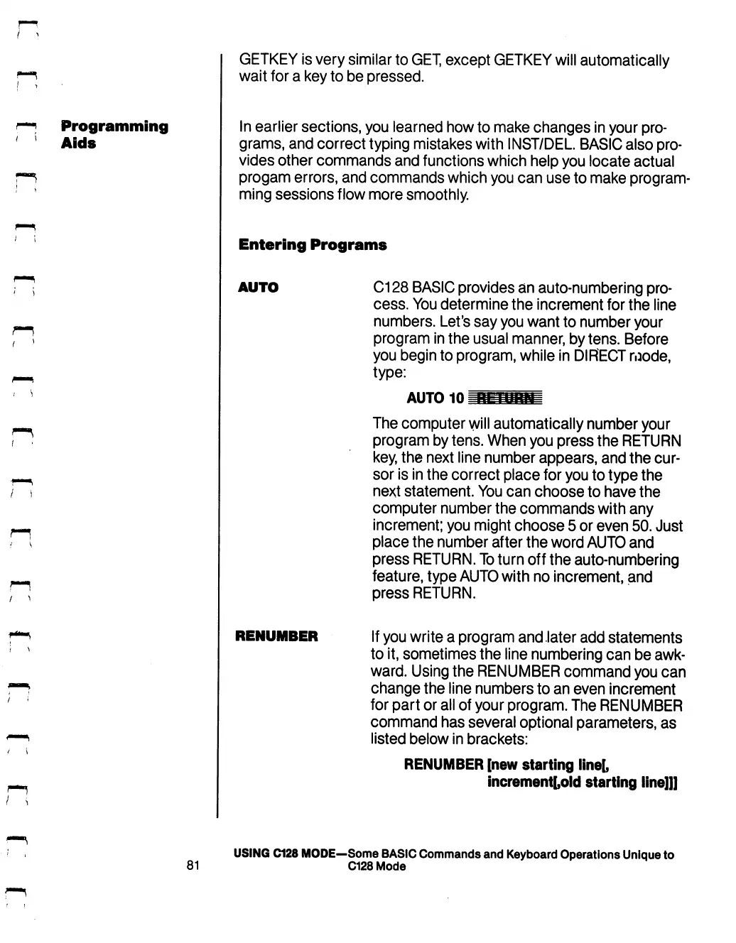Commodore 128D - Programming Aids; Entering Programs; Auto; Renumber