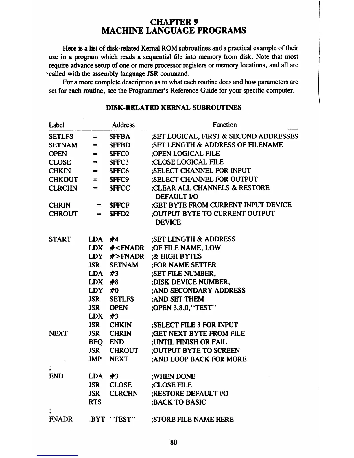 Commodore 1541-II - Chapter 9: Machine Language Programs; Disk-Related Kernafl Subroutines