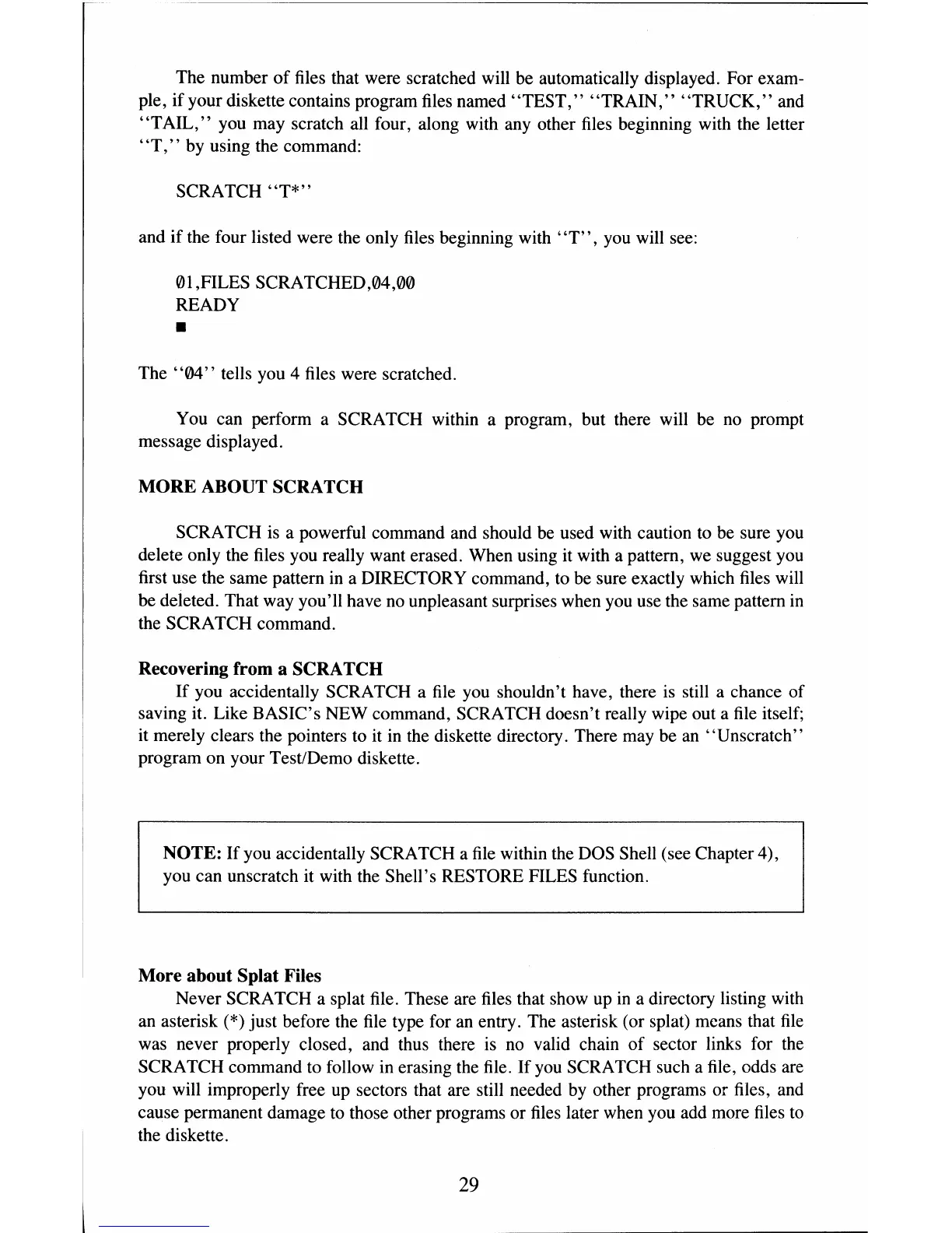 saving it. Like BASIC's NEW command, SCRATCH doesn't really wipe out a file itself;