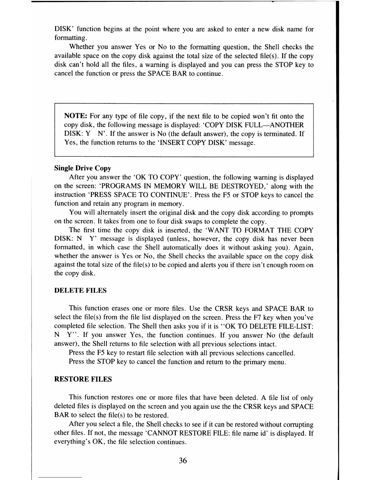 This function erases one or more files. Use the CRSR keys and SPACE BAR