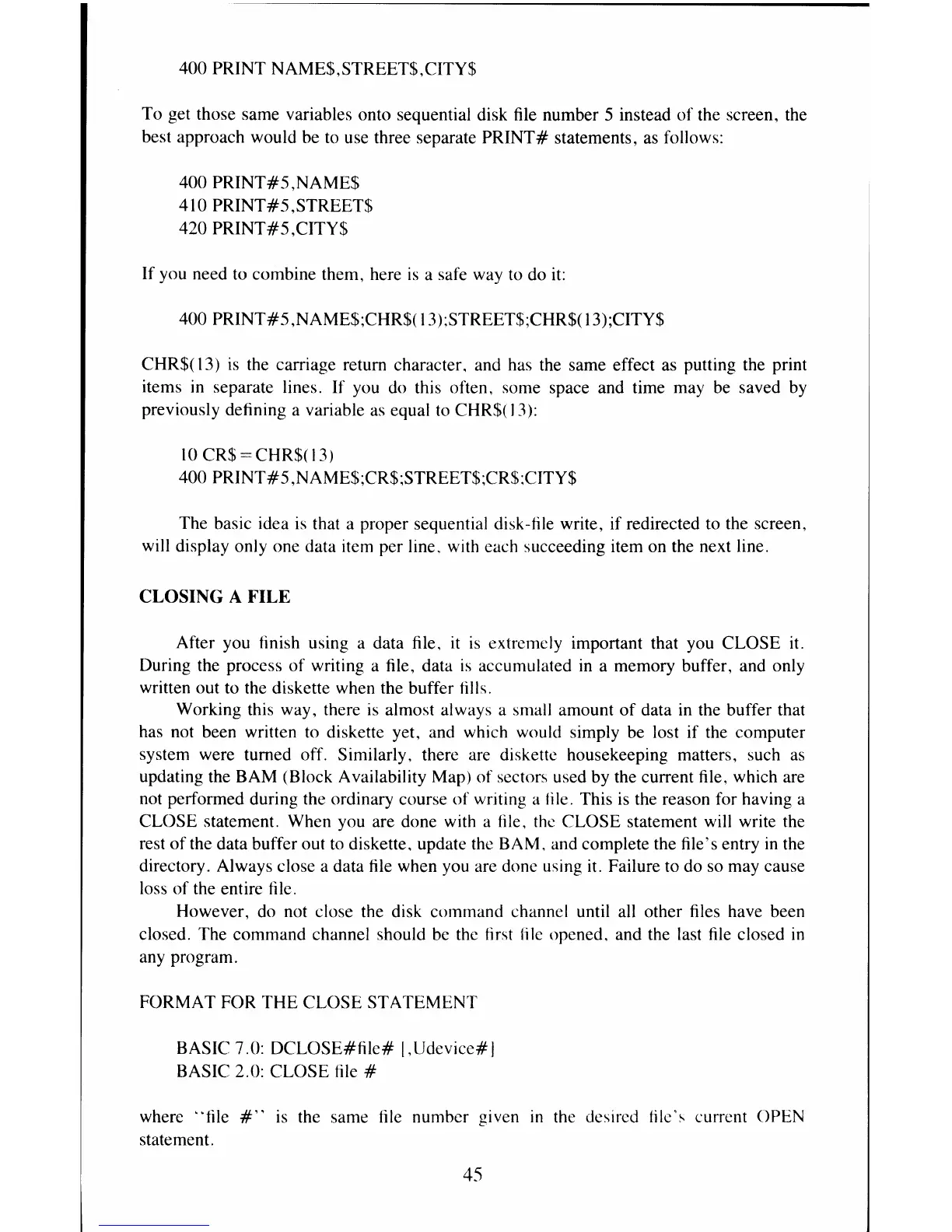 400 PRINT#5,NAME$;CR$;STREET$;CR$;CITY$