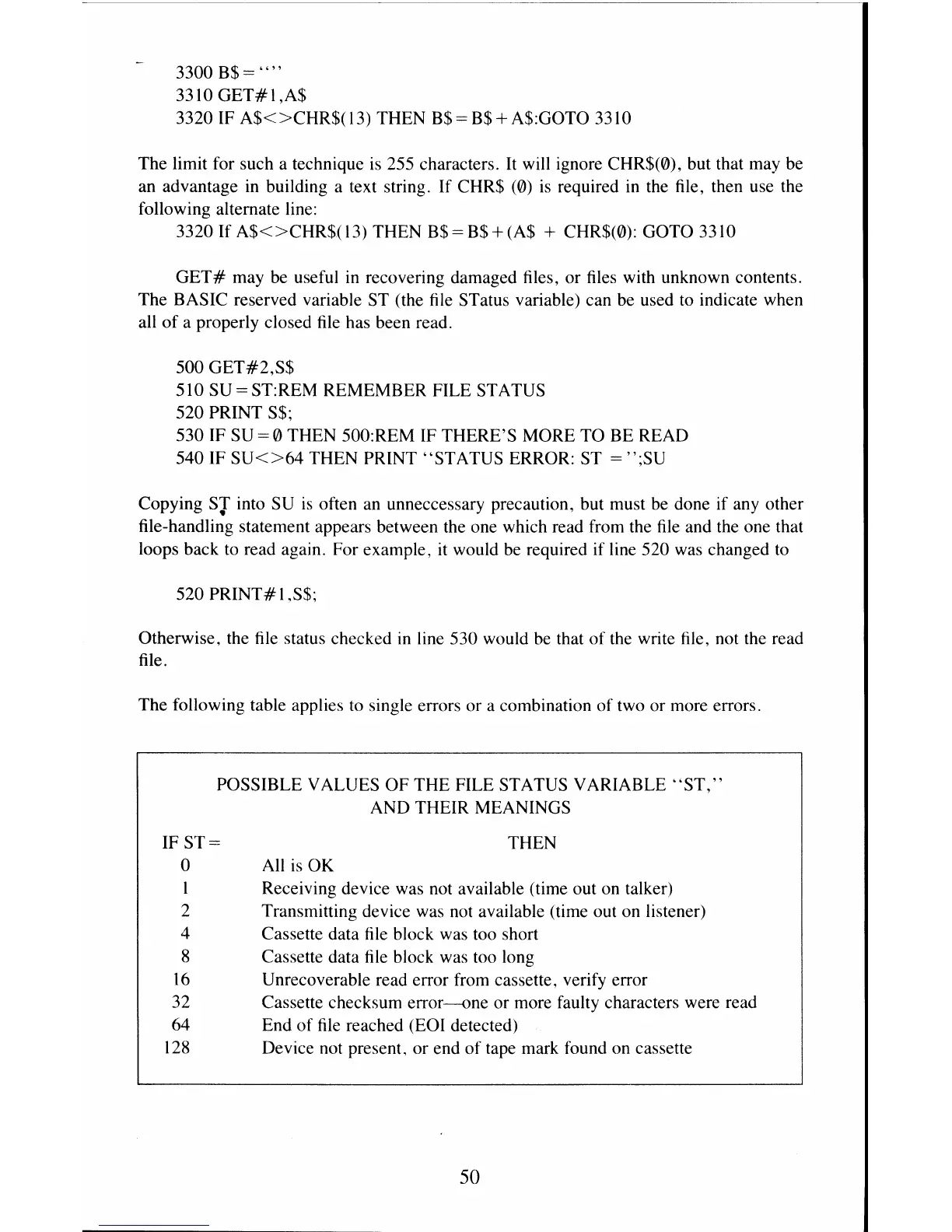 POSSIBLE VALUES OF THE FILE STATUS VARIABLE" ST,"