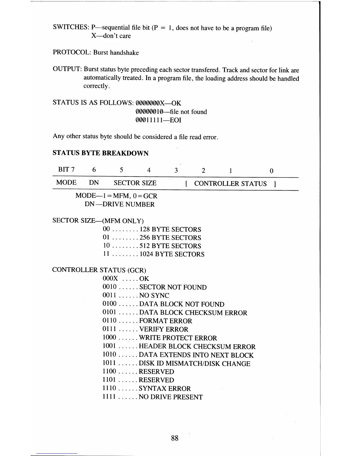 OUTPUT: Burst status byte preceding each sector transfered. Track and sector for