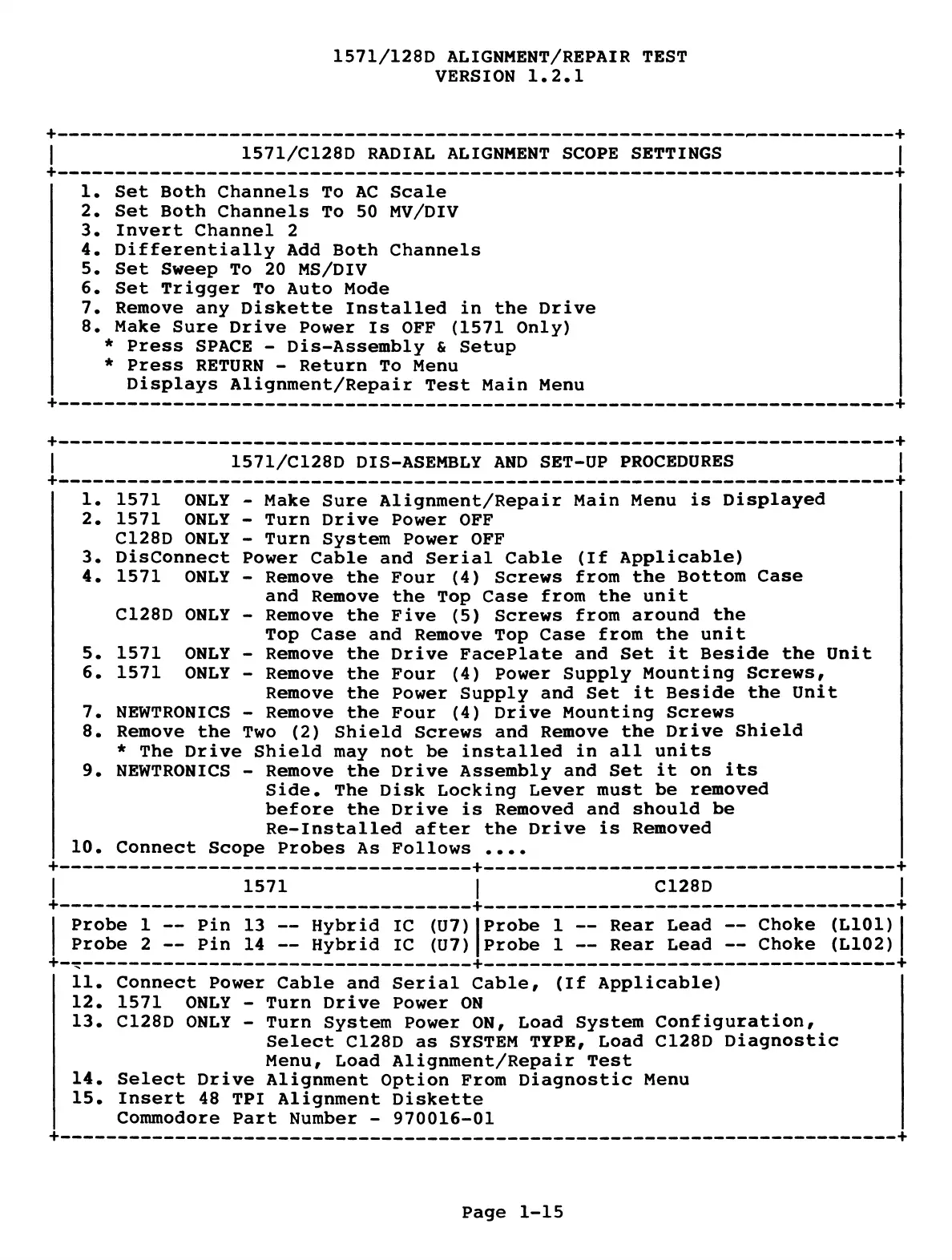 1571/C128D DIS-ASEMBLY AND SET-UP PROCEDURES