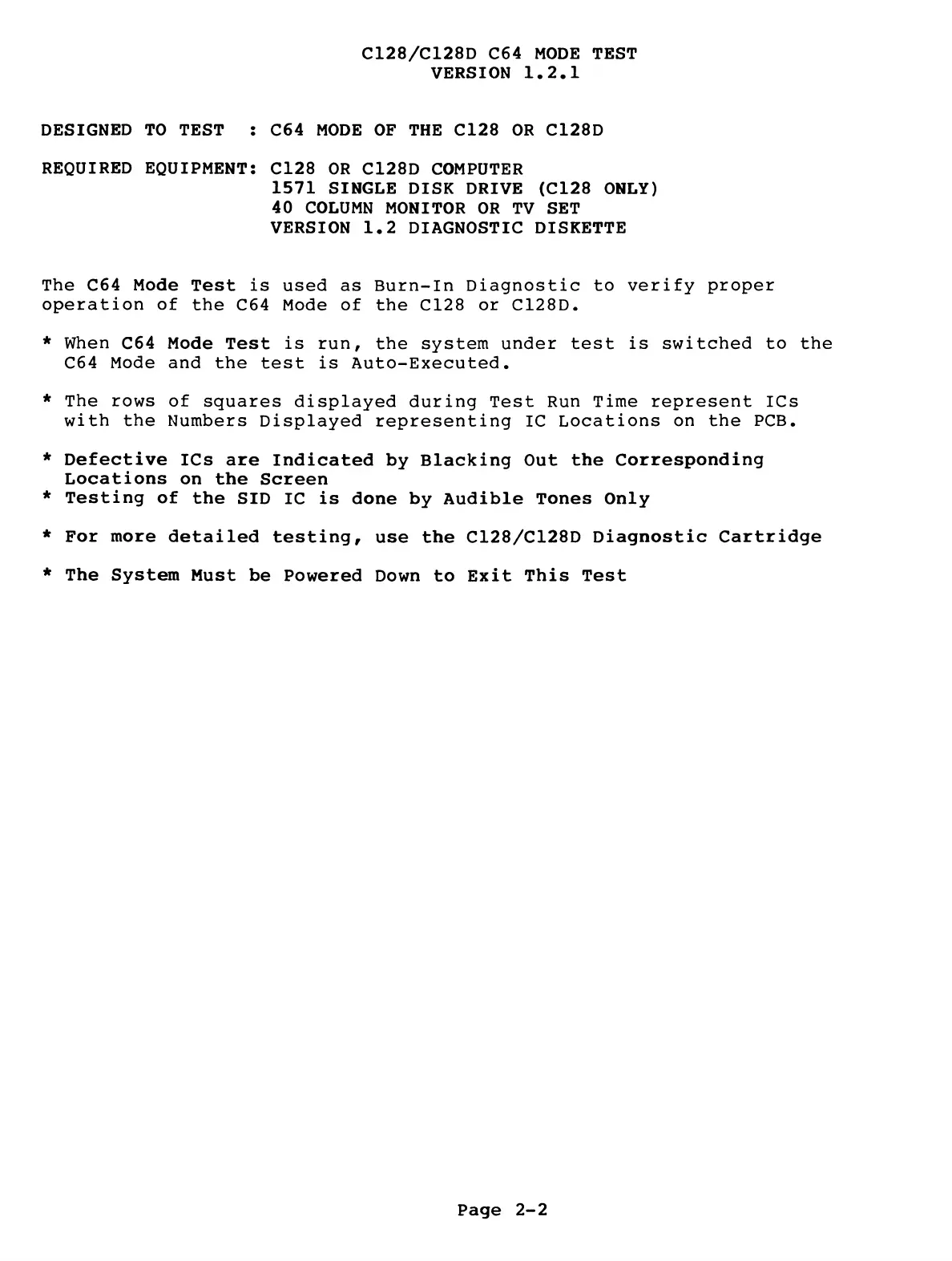 The C64 Mode Test is used as Burn-In Diagnostic to verify proper