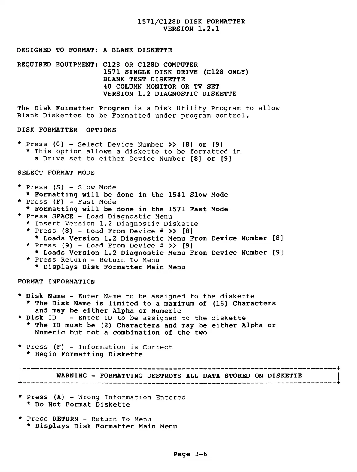 | WARNING - FORMATTING DESTROYS ALL DATA STORED ON DISKETTE |