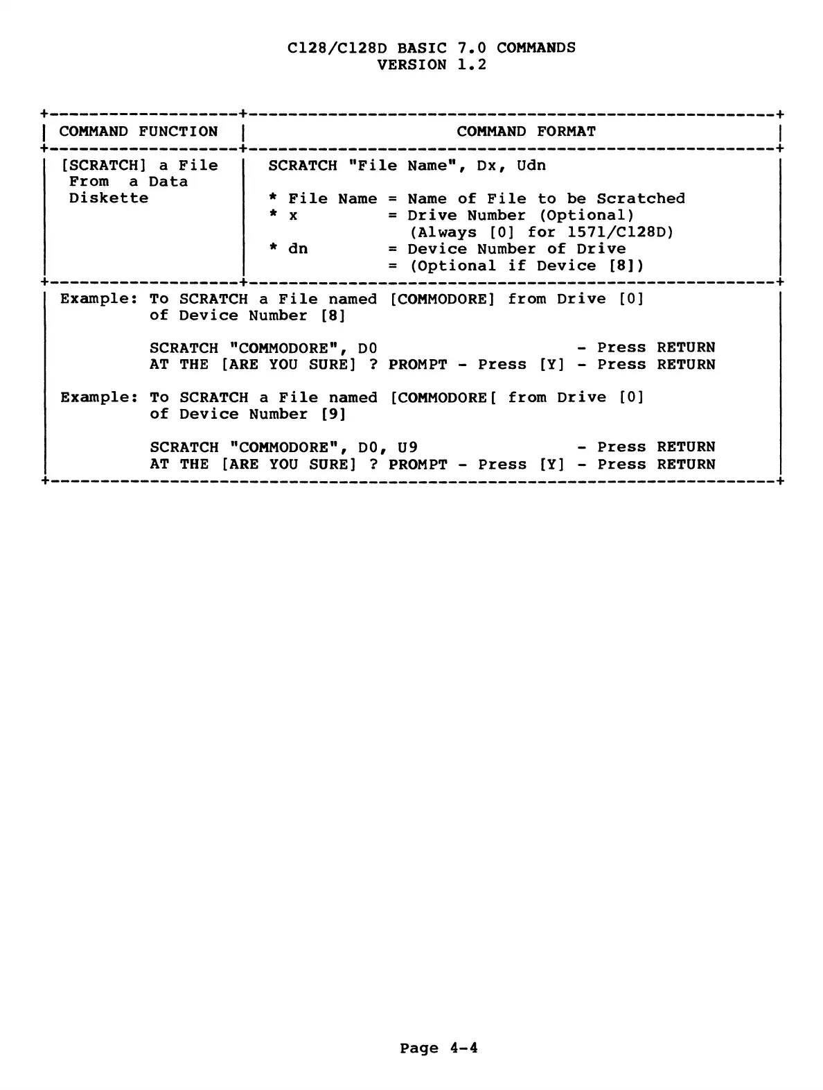 Example: To SCRATCH a File named [COMMODORE] from Drive [0]