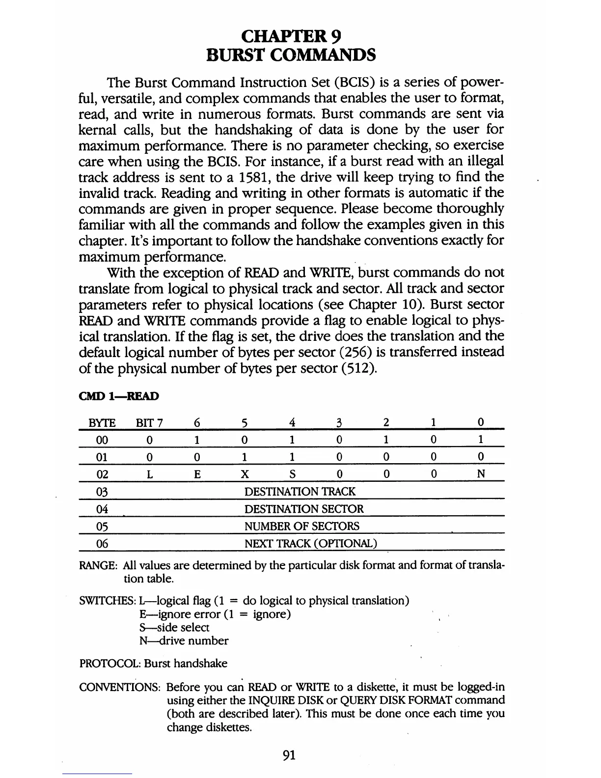 Commodore 1581 - Chapter 8: Machine Language Programs; Disk-Related Kernal Subroutines; Chapter 9: Burst Commands; CMD 1: Read