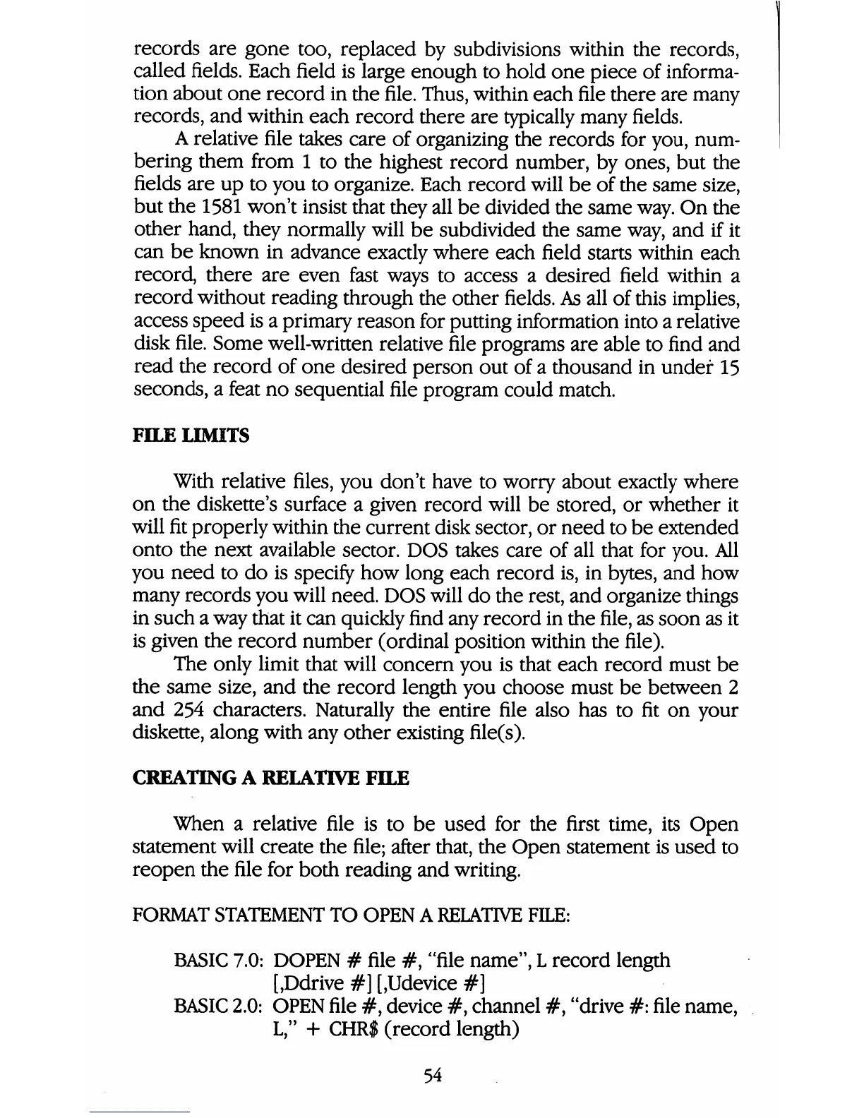 Commodore 1581 - Chapter 5: Relative Data Files; Files, Records, and Fields; File Limits for Relative Files