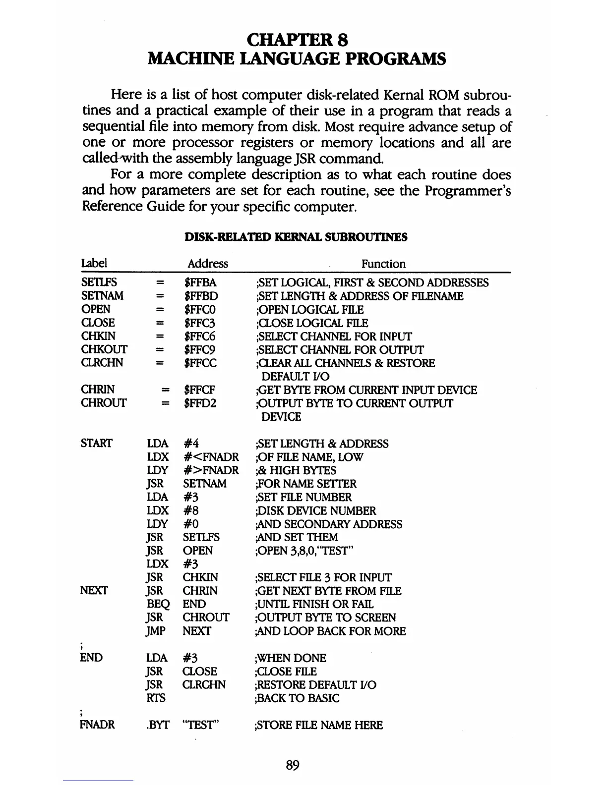 Commodore 1581 - Chapter 8: Machine Language Programs; Disk-Related Kernal Subroutines