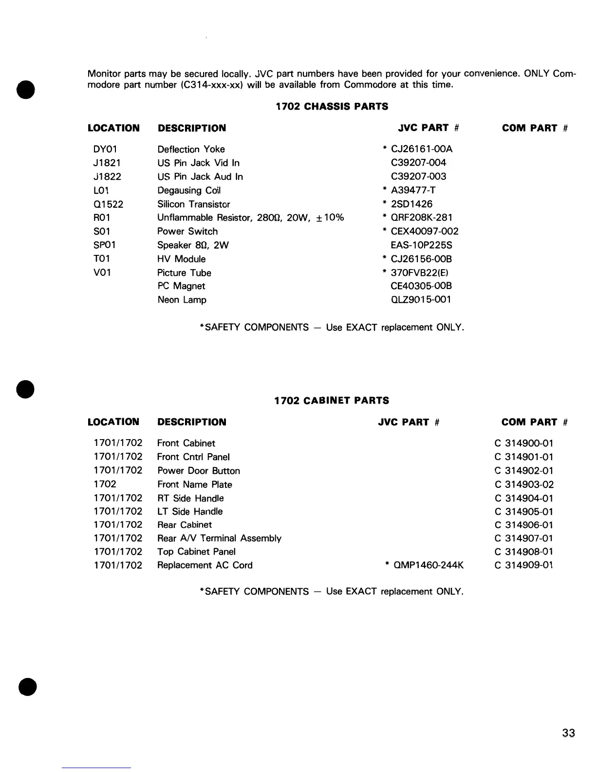 secured locally. JVC part numbers have been provided for your convenience. ONLY Com-