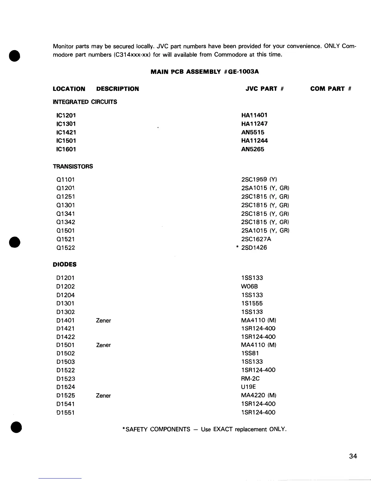 Commodore 1701 - MAIN PCB ASSEMBLY #GE-1003 A Parts