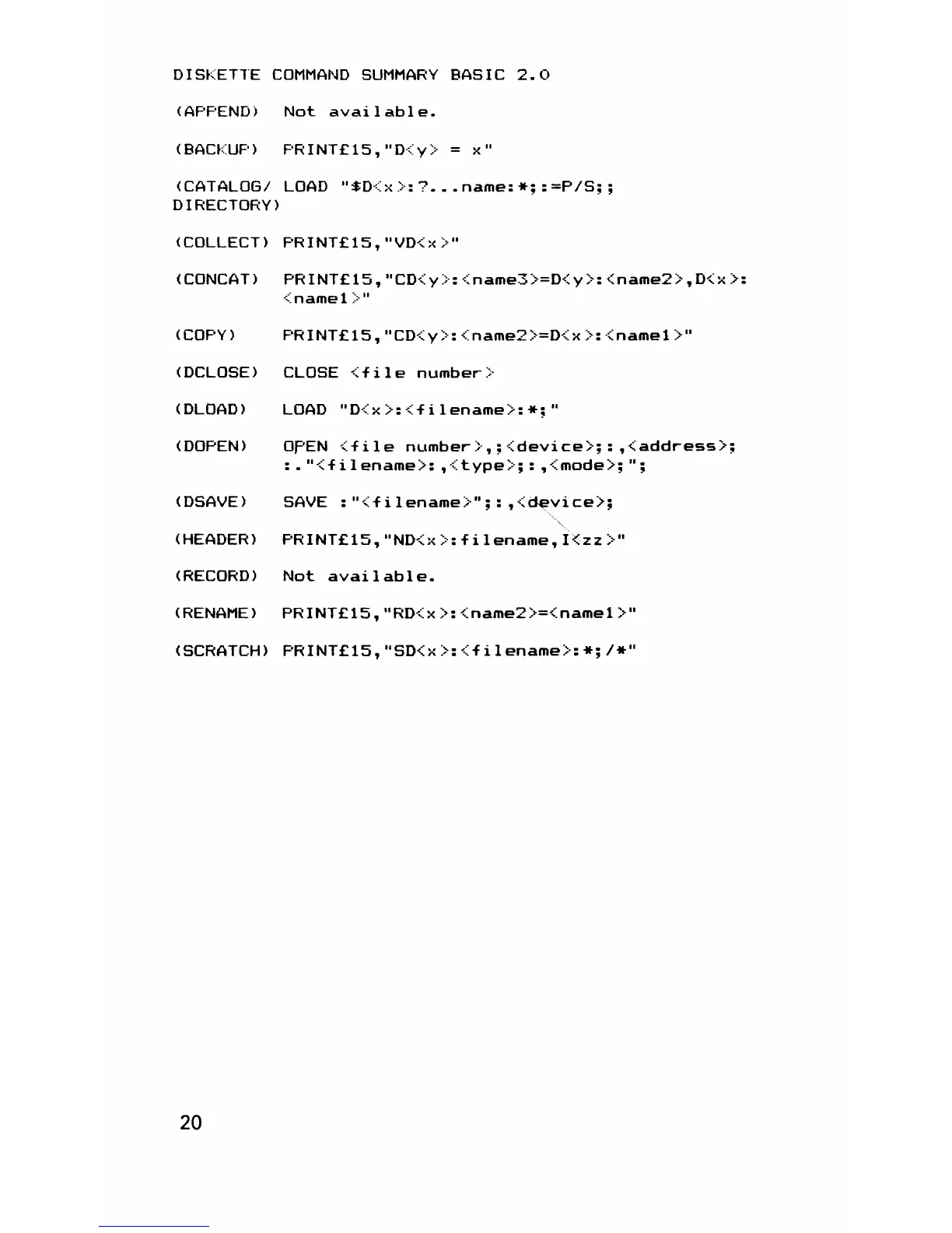 DISKETTE COMMAND SUMMARY BASIC 2-0