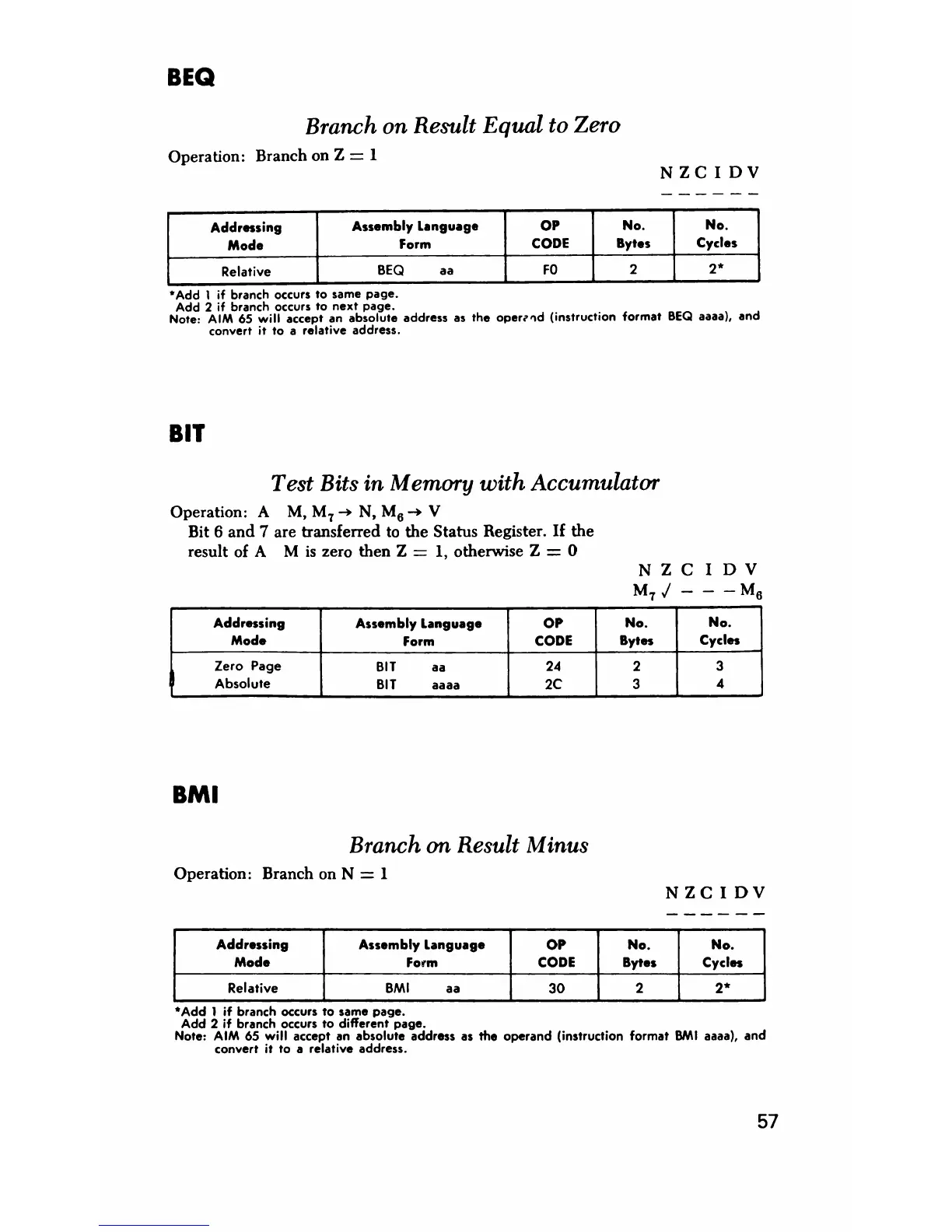 Note: AIM 65 will accept an absolute address as the operand (instruction format BMI aaaa), and