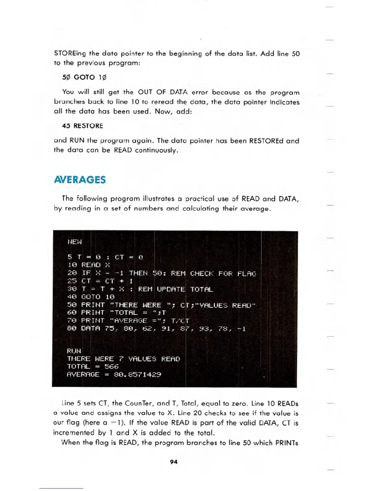 Line 5 sets CT,the CounTer,and T, Total,equal to zero. Line10 READs