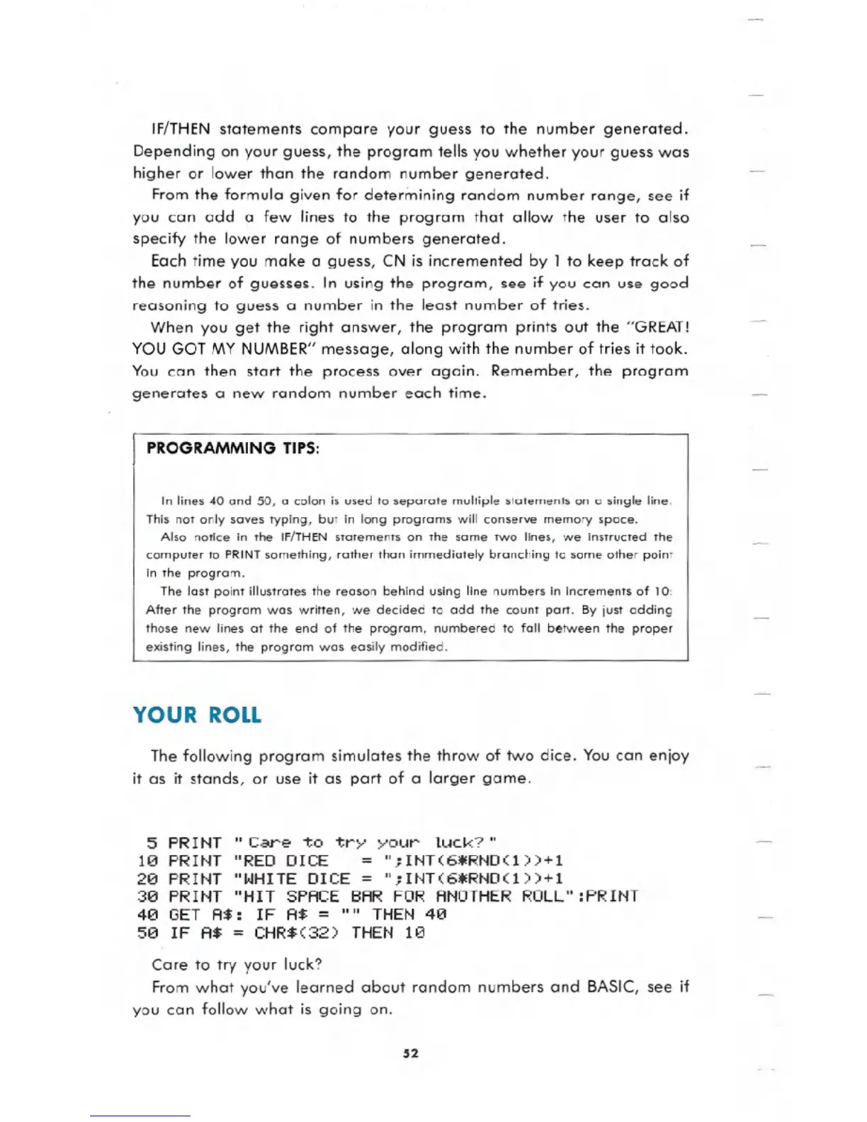 10 PRINT "RED DICE = ";INT(6*RND(I»+1