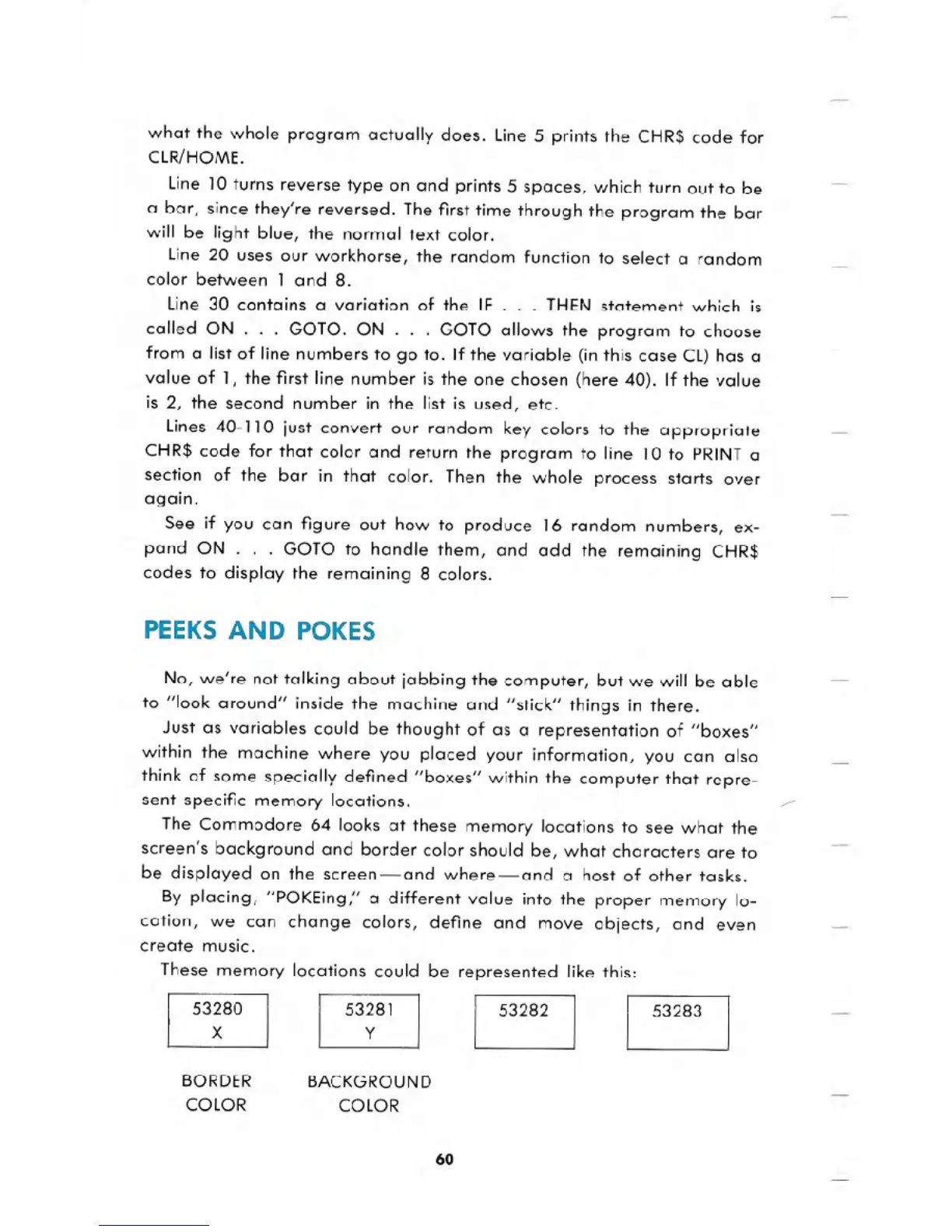 CHR$ code for that color and return the program to line 10 to PRINT a