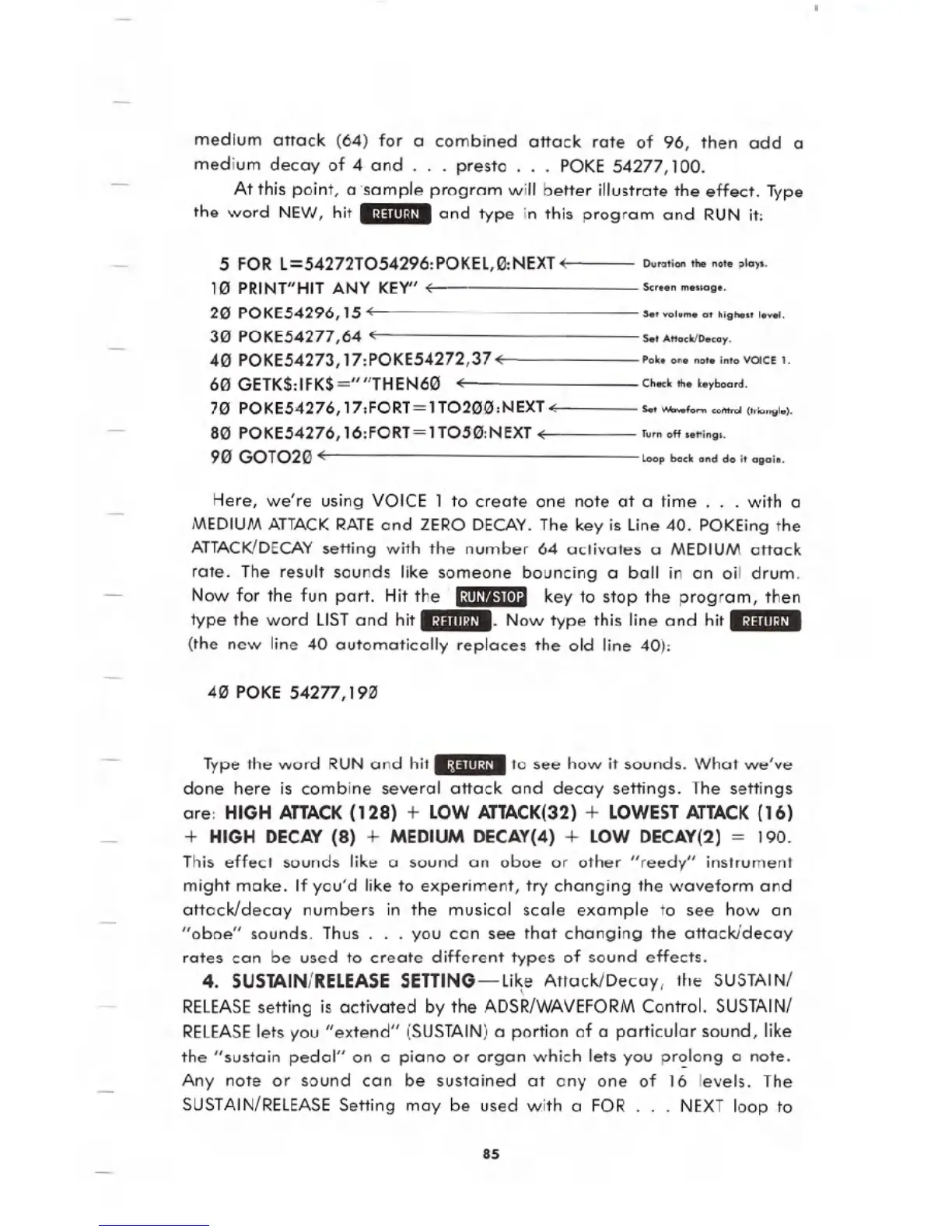 MEDIUMATTACKRATEand ZERO DECAY.The key is Line 40. POKEing the