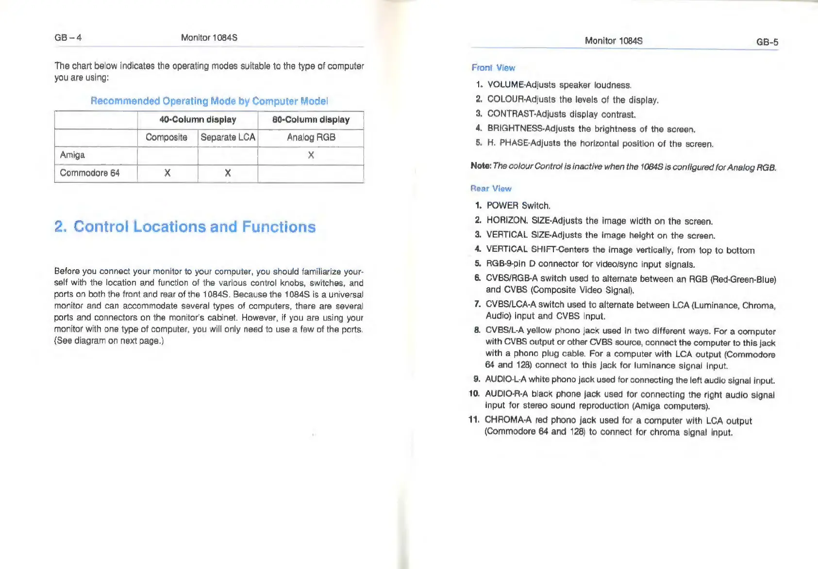 Commodore AMIGA 1084S - Control Locations and Functions; Front View Controls; Rear View Controls and Ports