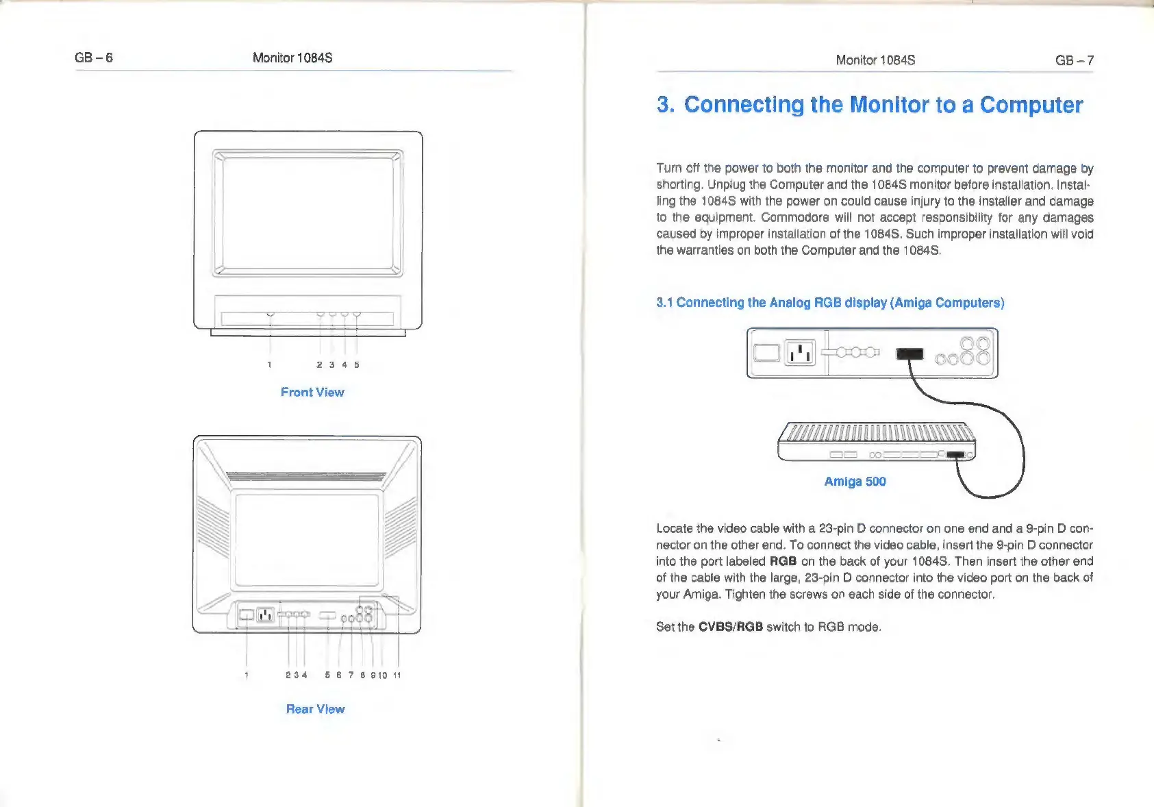 Commodore AMIGA 1084S - Connecting the Monitor to a Computer; Connecting the Analog RGB Display
