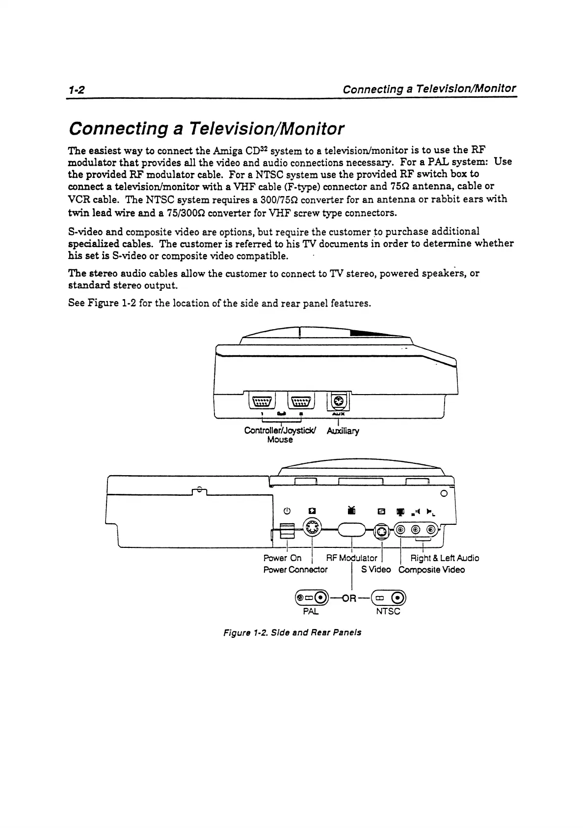 The easiest way to connect the Amiga CD32 System to a television/monitor is to use the RF