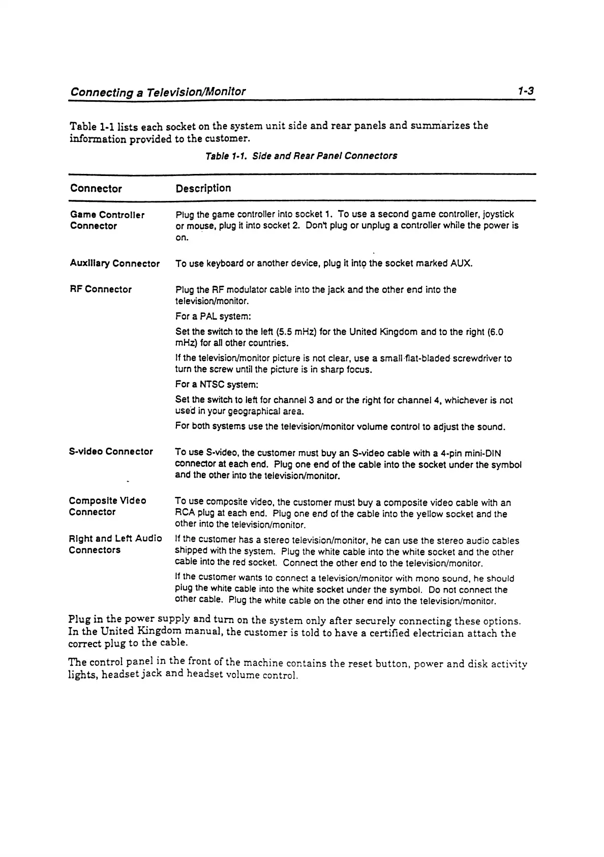 Table 1-1 lists each socket on the System unit side and rear panels and summarizes the