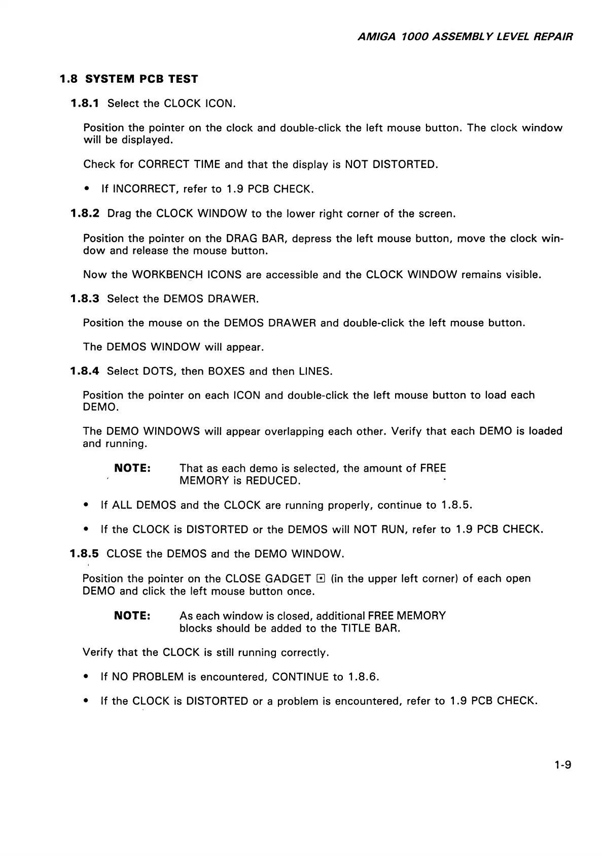 • If ALL DEMOS and the CLOCK are running properly, continue to 1.8.5.