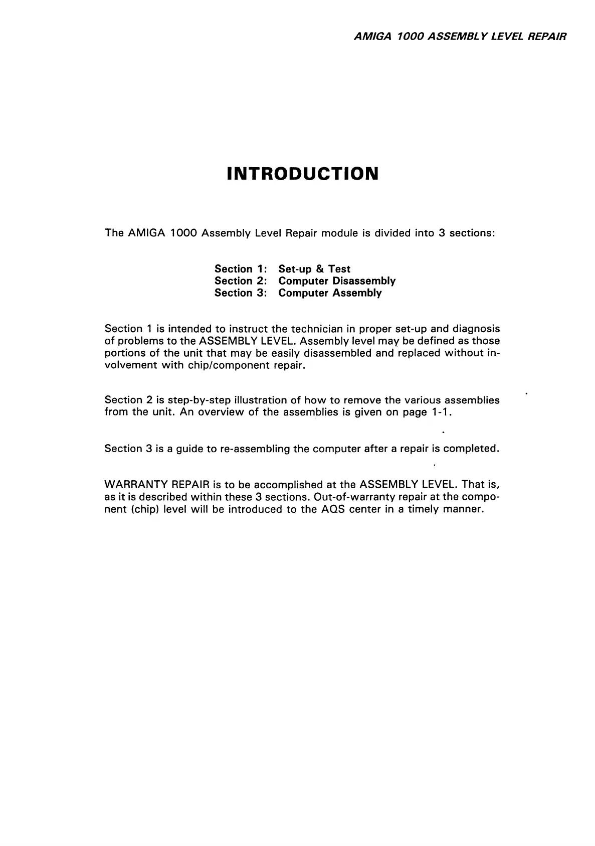 The AMIGA 1000 Assembly Level Repair module is divided into 3 sections: