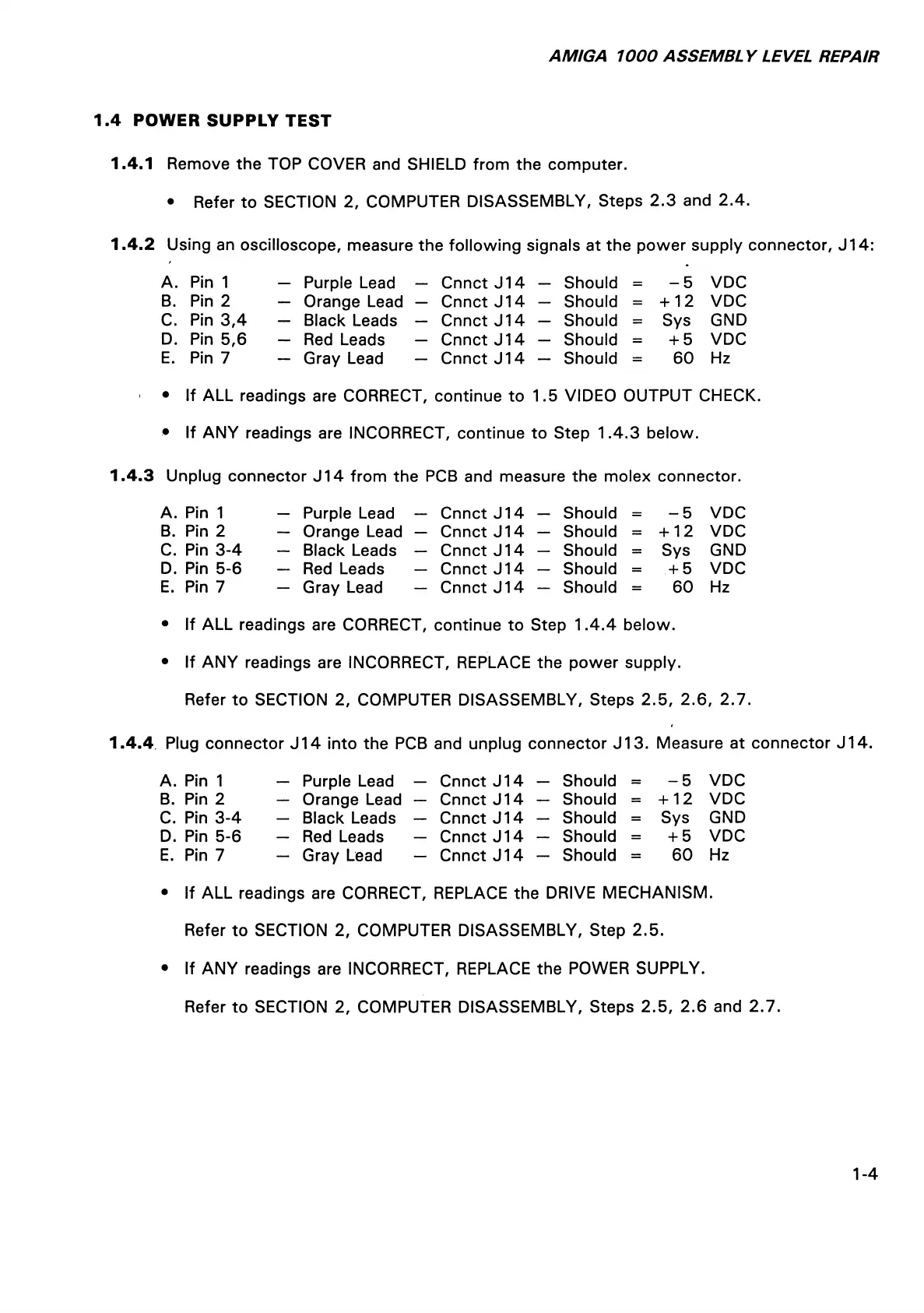 1.4.2 Using an oscilloscope, measure the following signals at the power supply connector, J14: