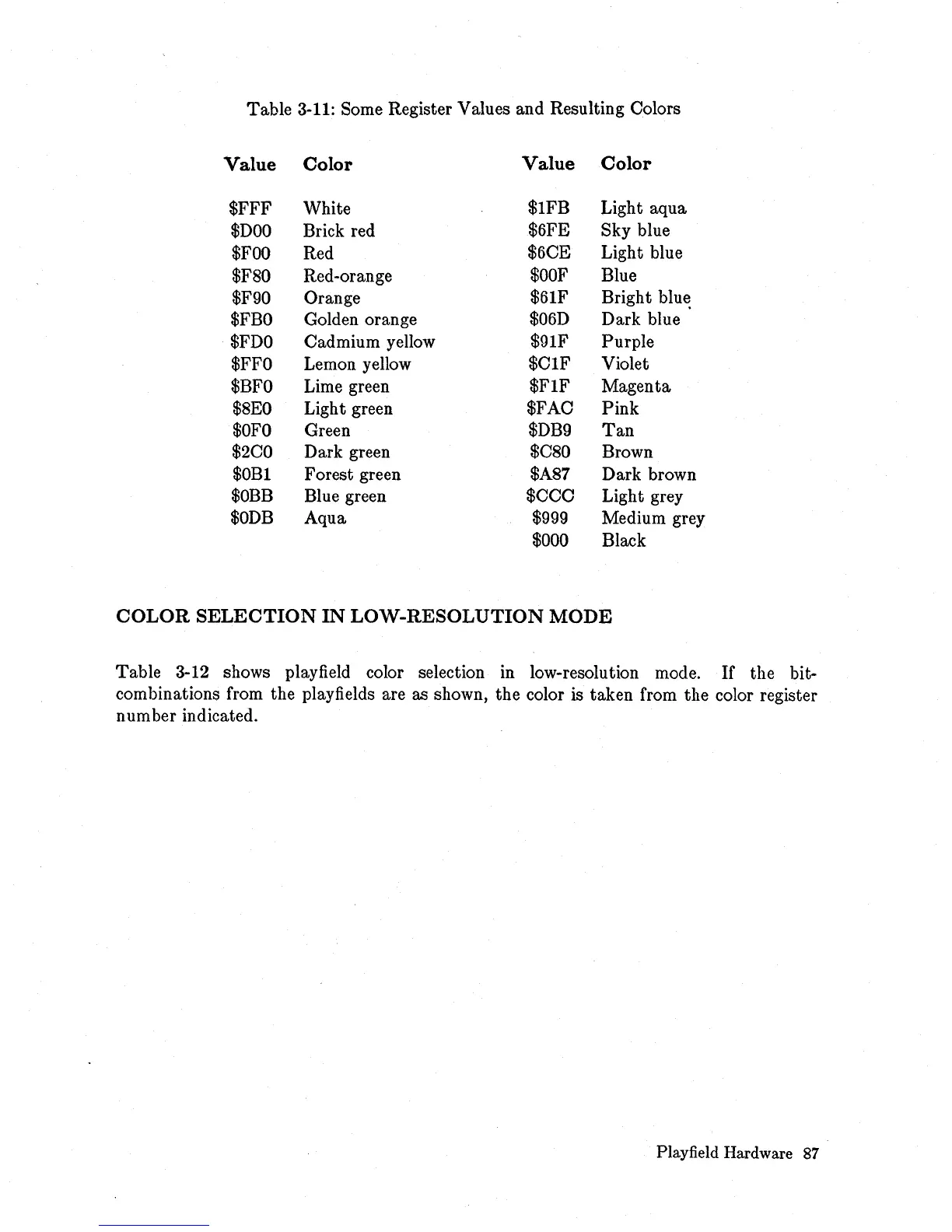 Table 3-12 shows playfield color selection in low-resolution mode.