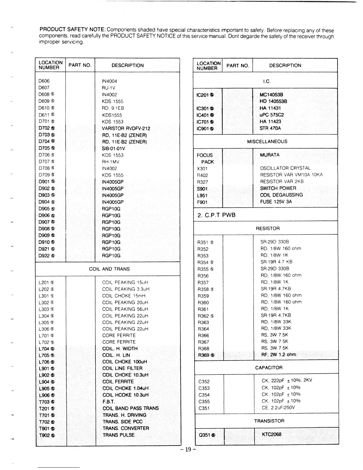 PRODUCT SAFETY NOTE: Components shaded have special characteristics important to safety. Before replacing any