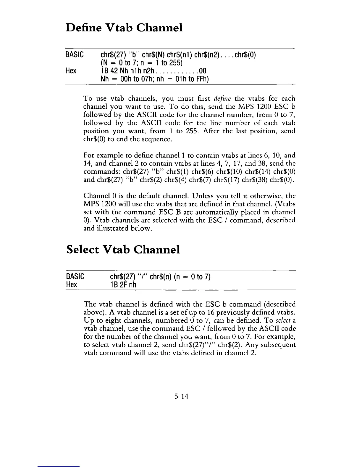 to select vtab channel 2, send chr$(27)"1" chr$(2). Any subsequent