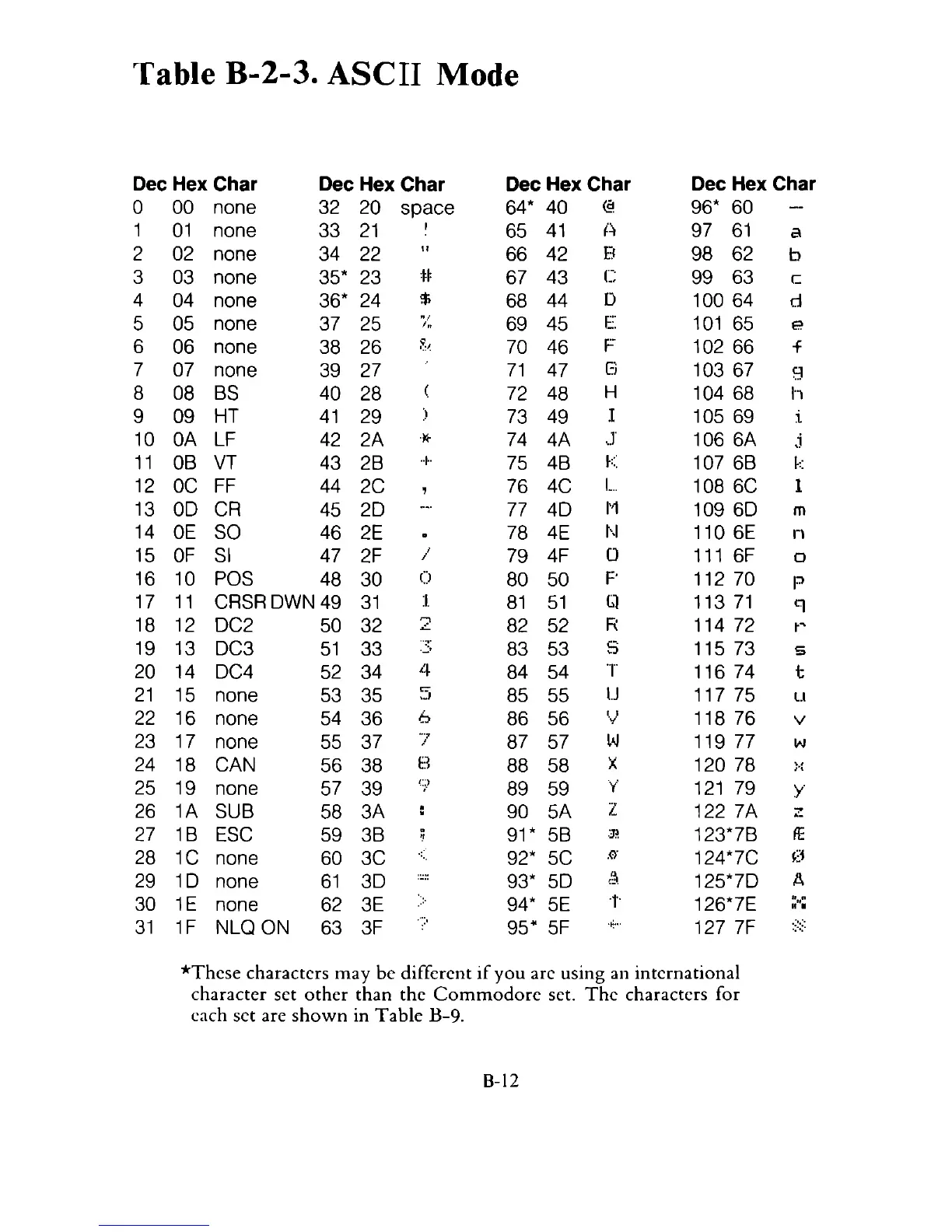 Table B-2-3. ASCII Mode
