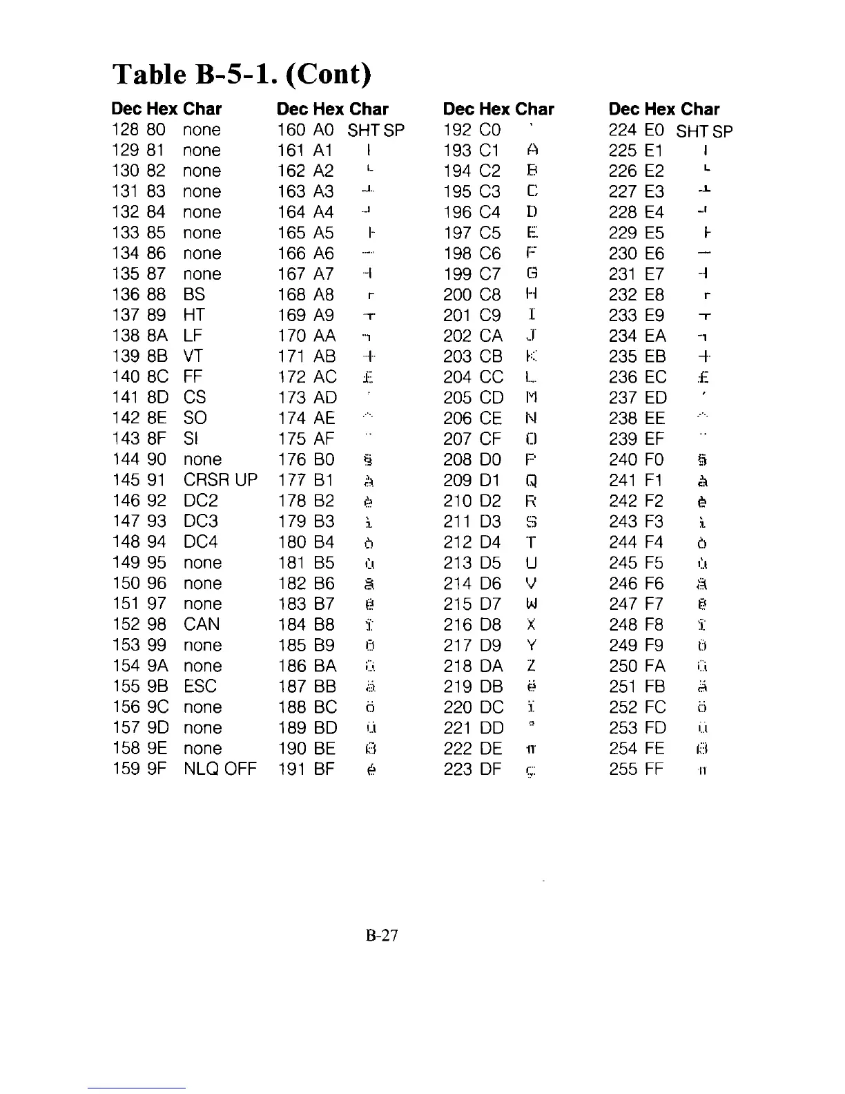 Dec Hex Char Dec Hex Char