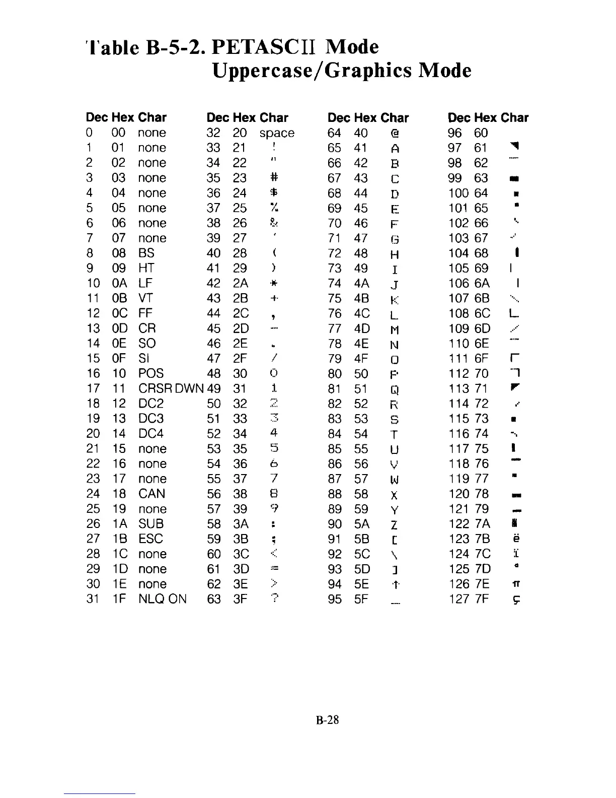 Table B-5-2. PETASCII Mode