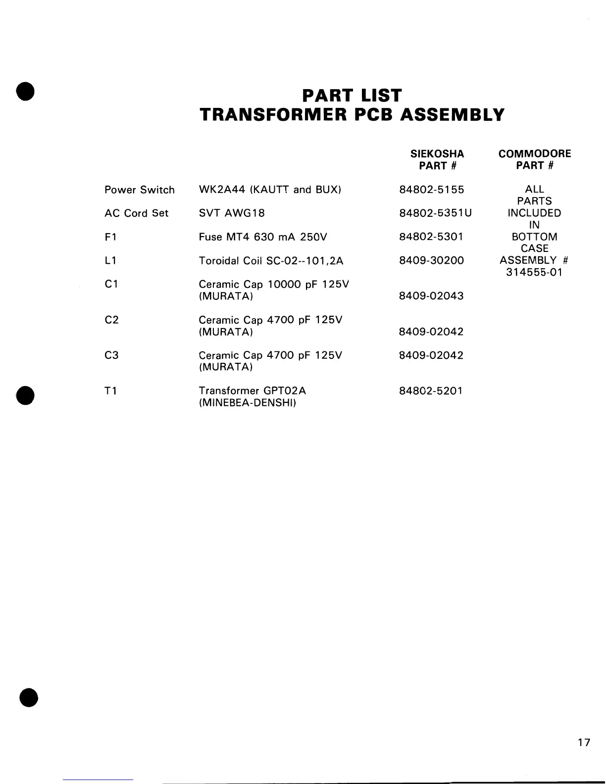 Commodore MPS-801 - Transformer Pcb Assembly; Parts