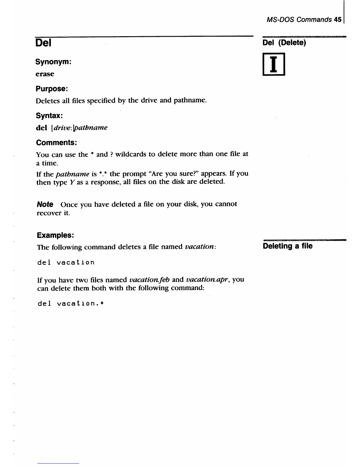 following command deletes a file named vacation: