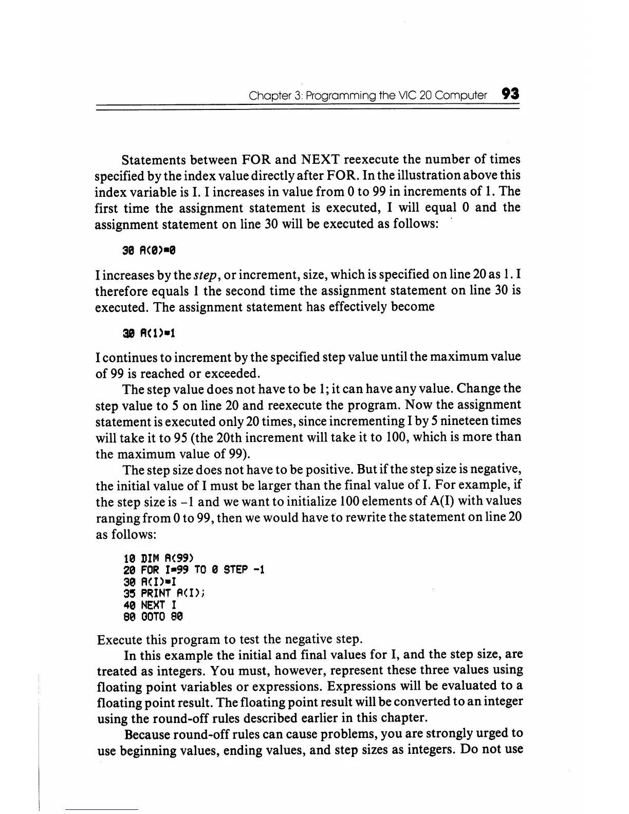 this example the initial and final values for I, and the step size, are
