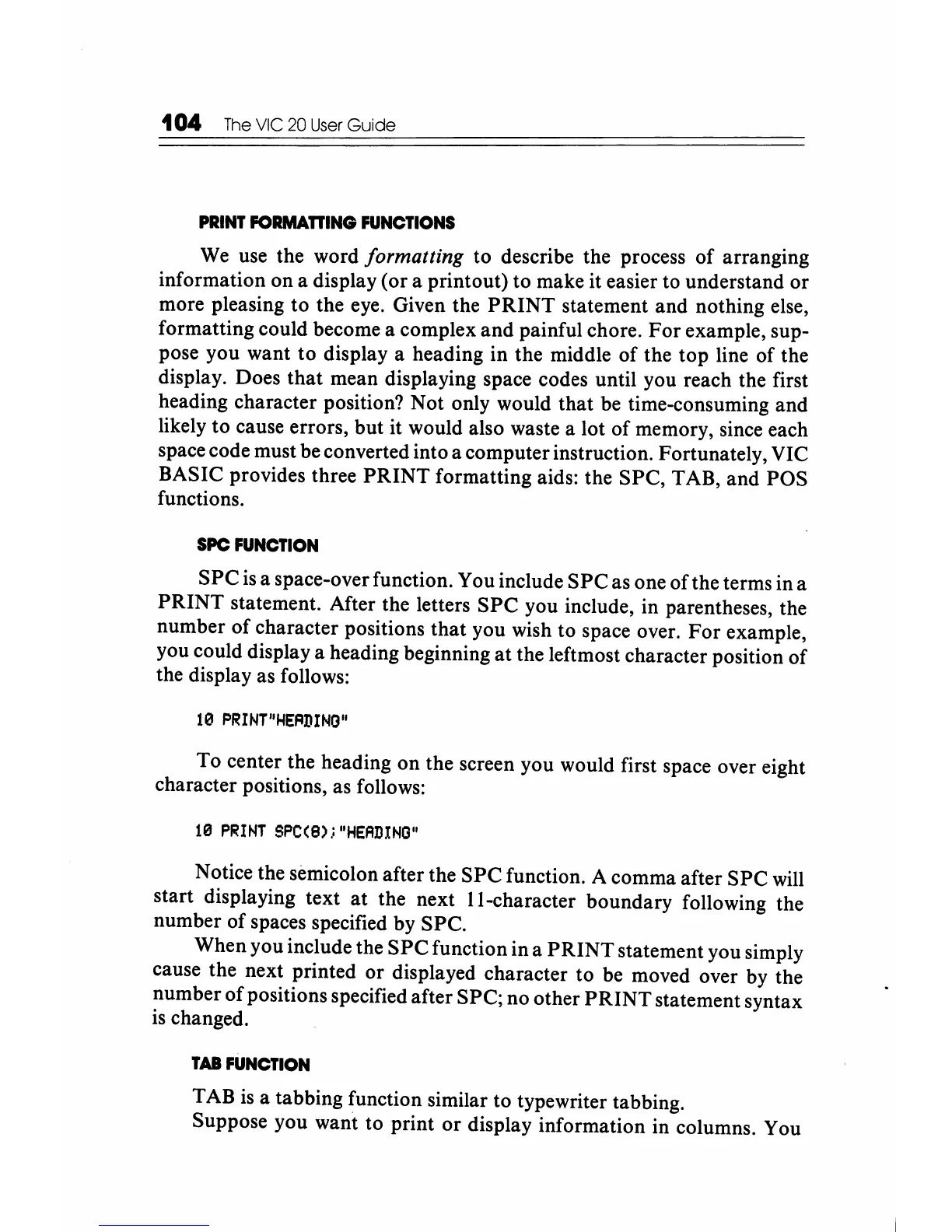 formatting aids: the SPC, TAB, and POS