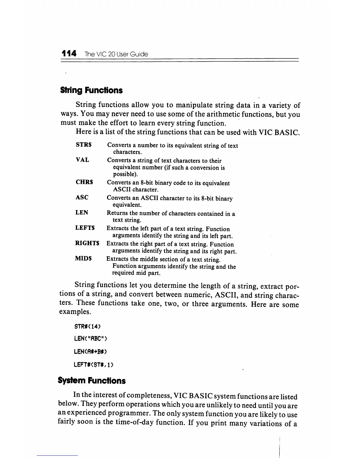 completeness, VIC BASIC system functions are listed