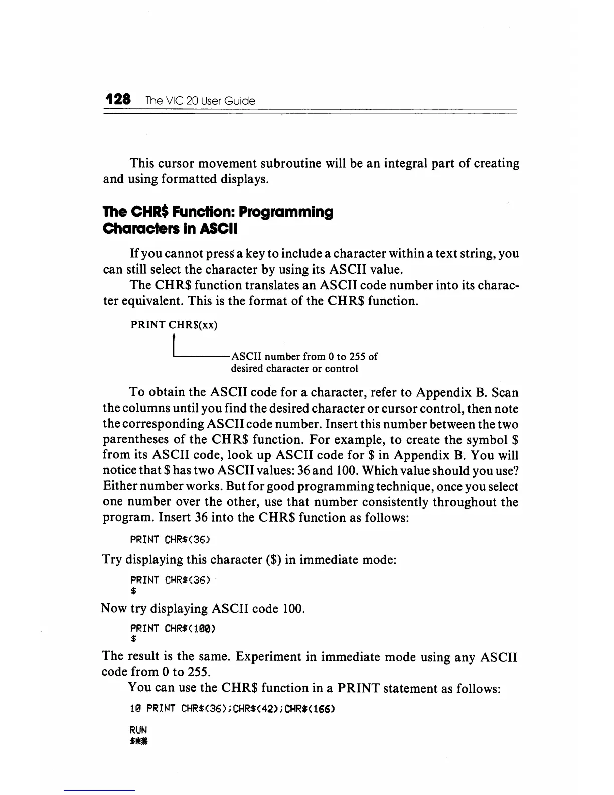 The CHR$ function translates an ASCII code number into its charac-