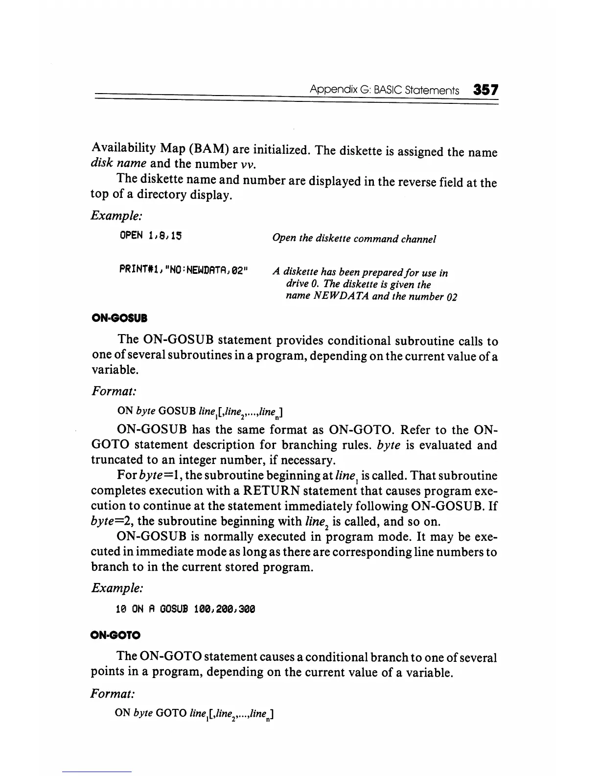 ON-GOSUB has the same format as ON-GOTO. Refer to the ON-