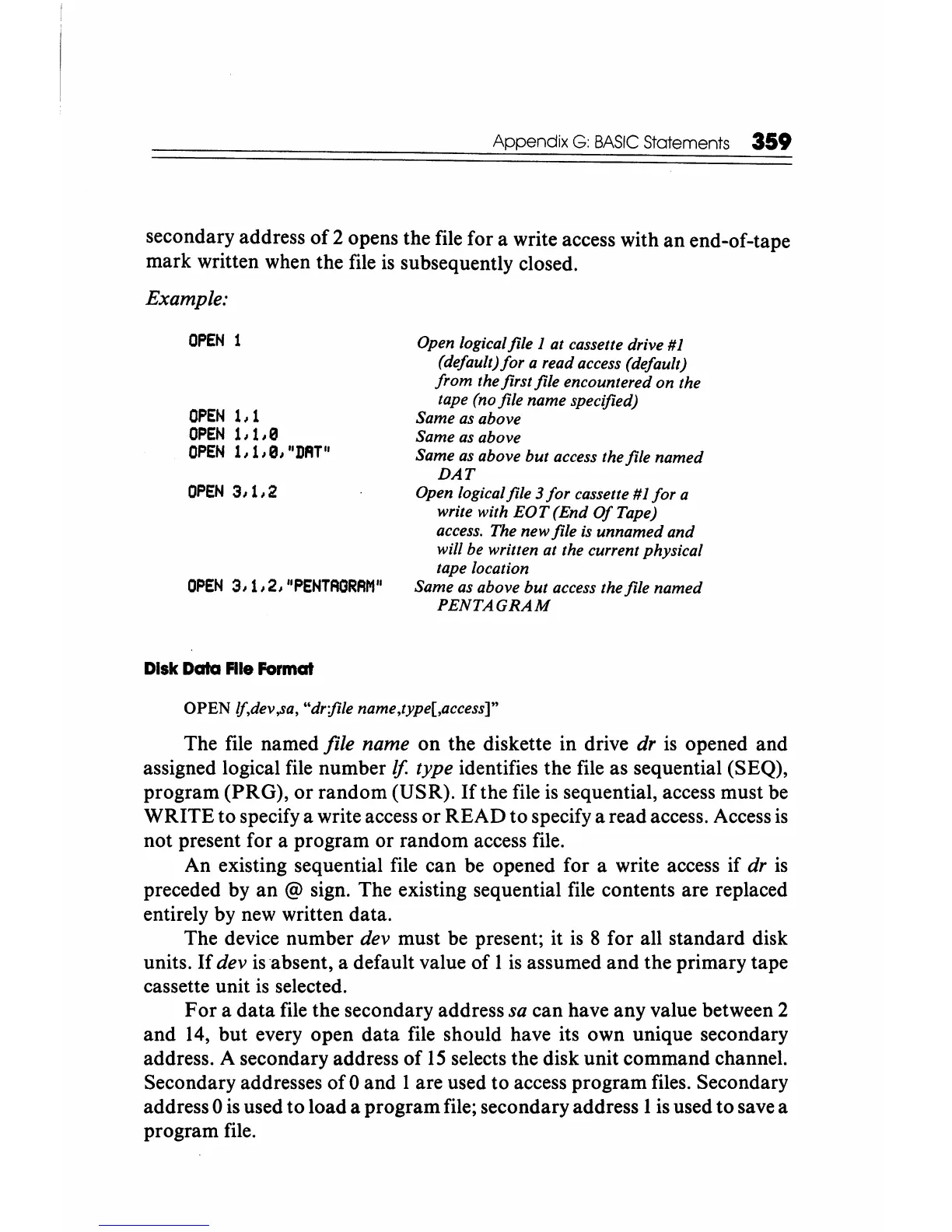OPEN /f,dev,sa, "dr;file name,type[,access]"