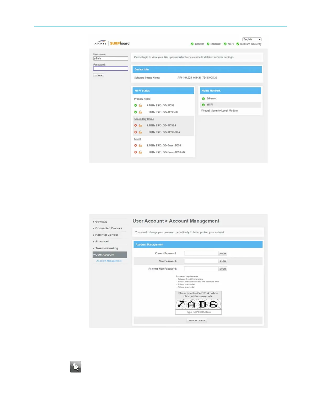6. Click the User Account main menu link to change the password.