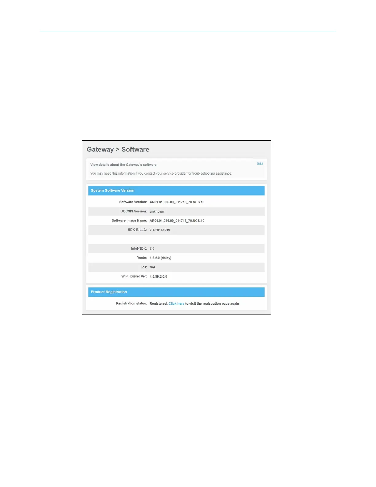 The Gateway Software Version screen displays device software related information for