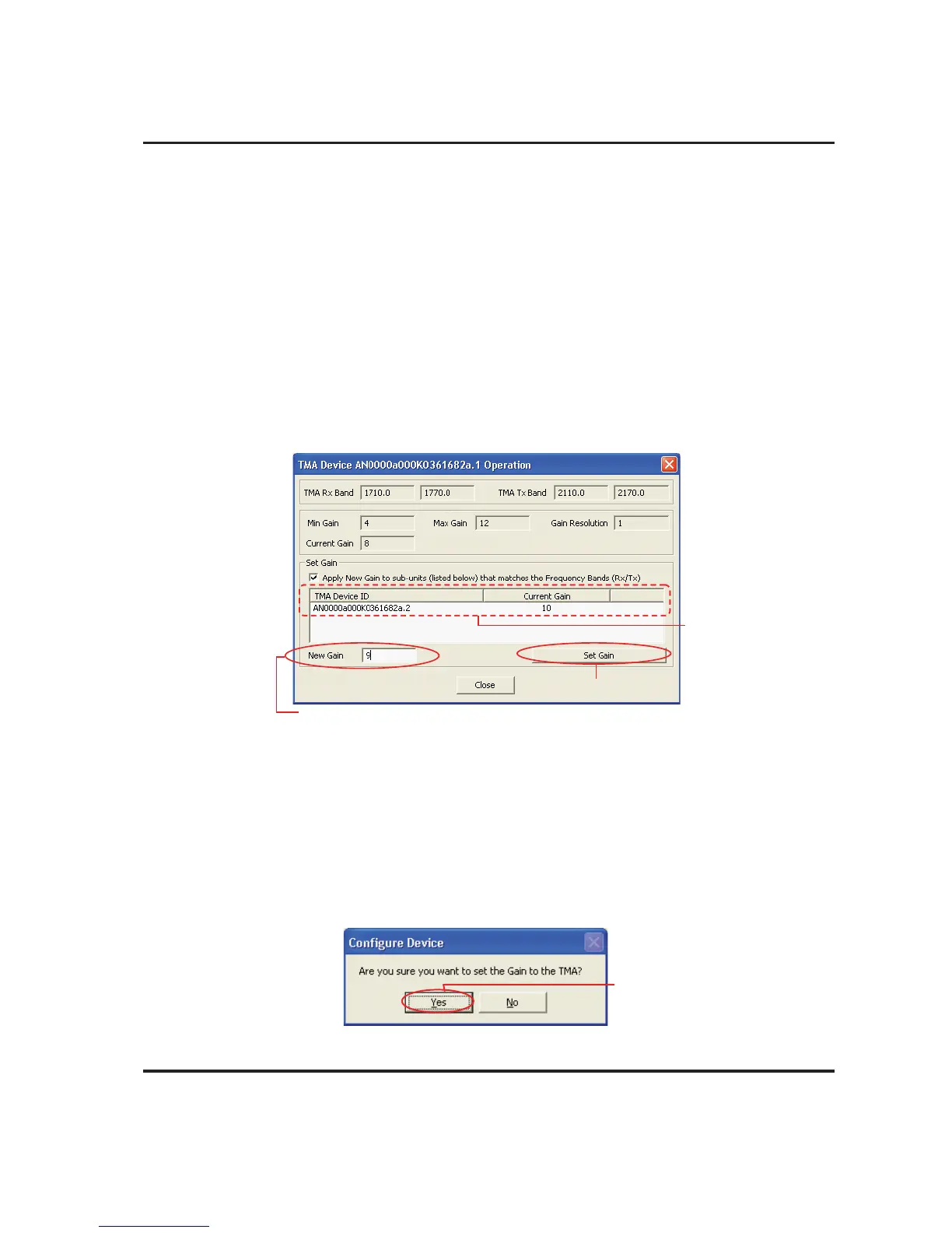 that the new Gain is to be applied to the TMA. Click Yes to proceed with the sending of new