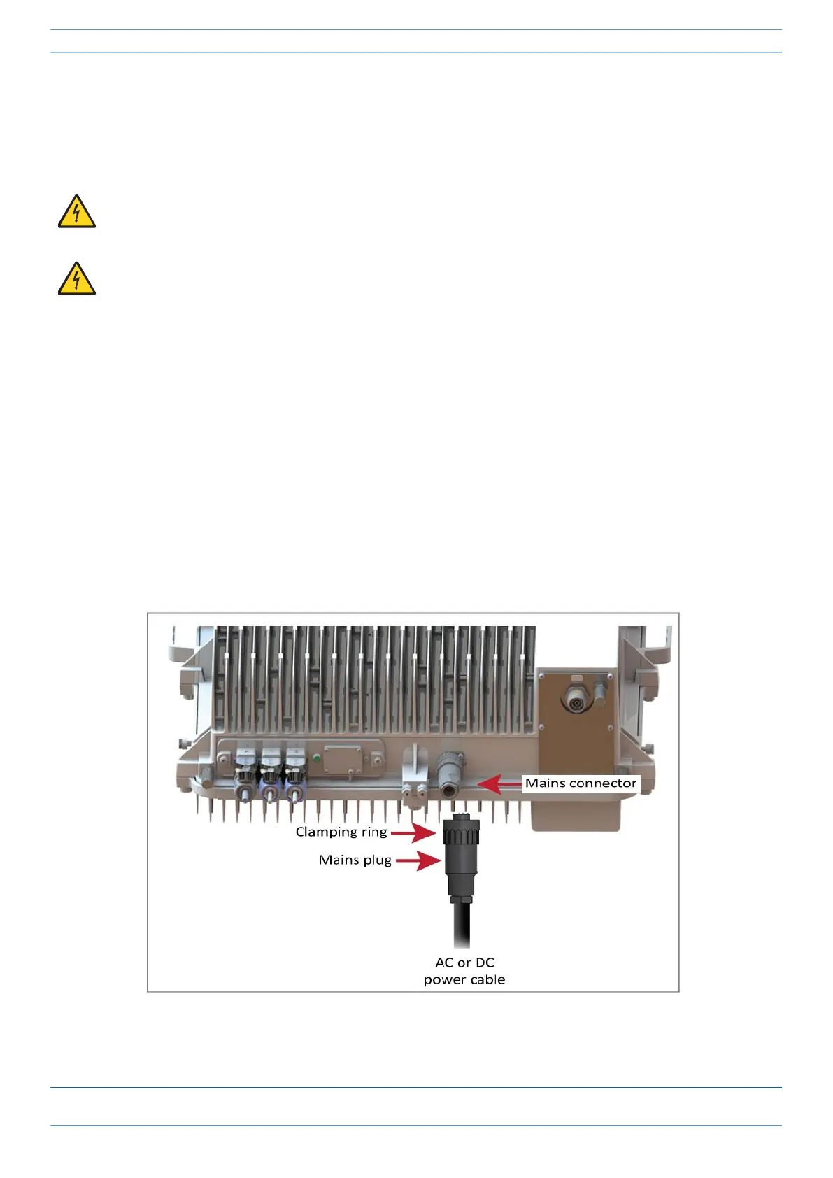 7 Insert the AC or DC power cable into the Mains connector as shown below; tighten the clamping ring until