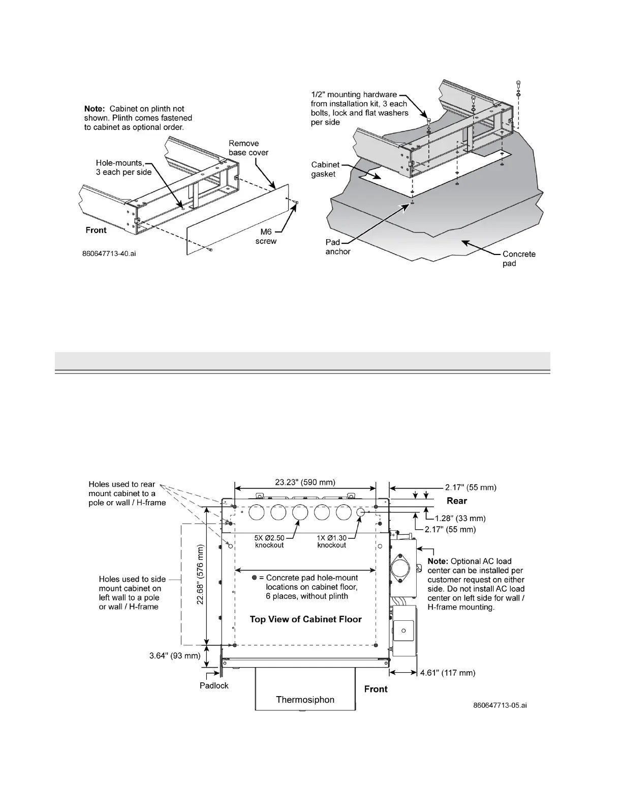 ■ For cabinet with plinth, see Figure 15, Figure 19, and Figure 21 to mount cabinet to pad.