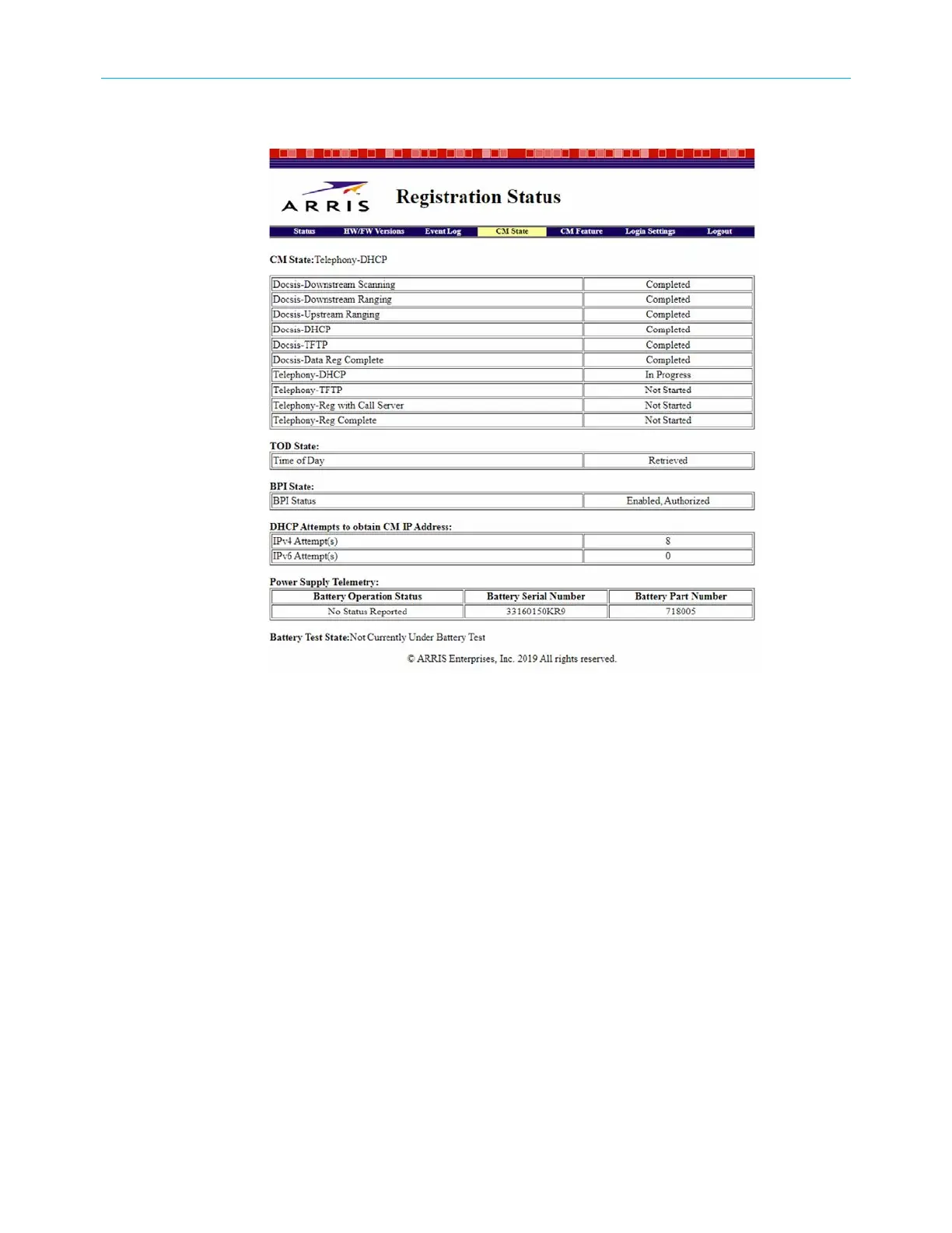 with regards to DOCSIS and telephony connections. It also indicates the test state of the