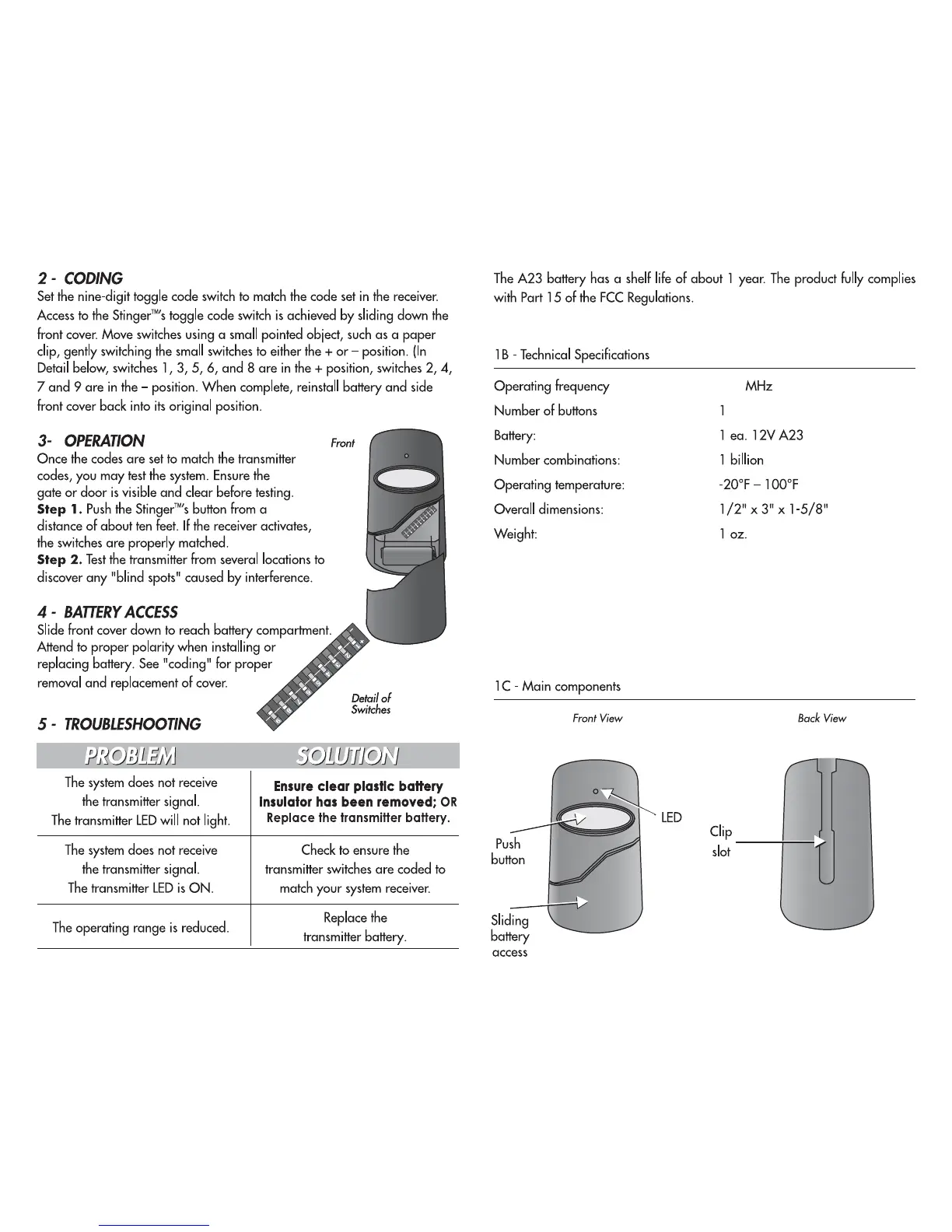 Community Controls Stinger - Coding; Operation; Battery Access; Troubleshooting